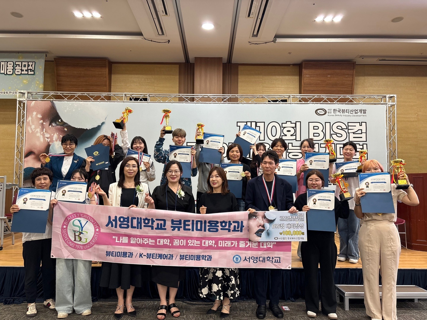 서영대학교 K-뷰티케어과 재학생 17명이 6월 1일 제10회 BIS(Korea Beauty Industry Development Society)컵 국제이•미용기능경기대회에서 헤어, 이용, 피부 네일 각 부문에서 대회장상, 금상, 은상 등을 참여자 전원이 수상 했다. 이번 대회는 고용노동부와 한국산업인력공단, 국제기능올림픽대회 한국위원회의 후원하고 사단법인 한국뷰티산업개발 주최로 김대중컨벤션센터에서 진행이 되었다.