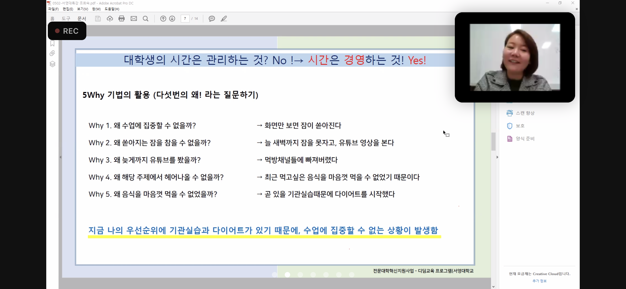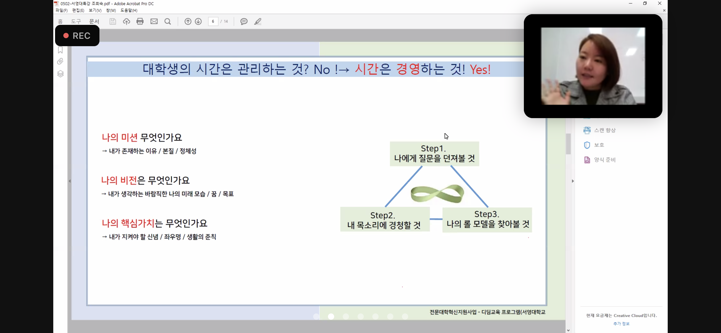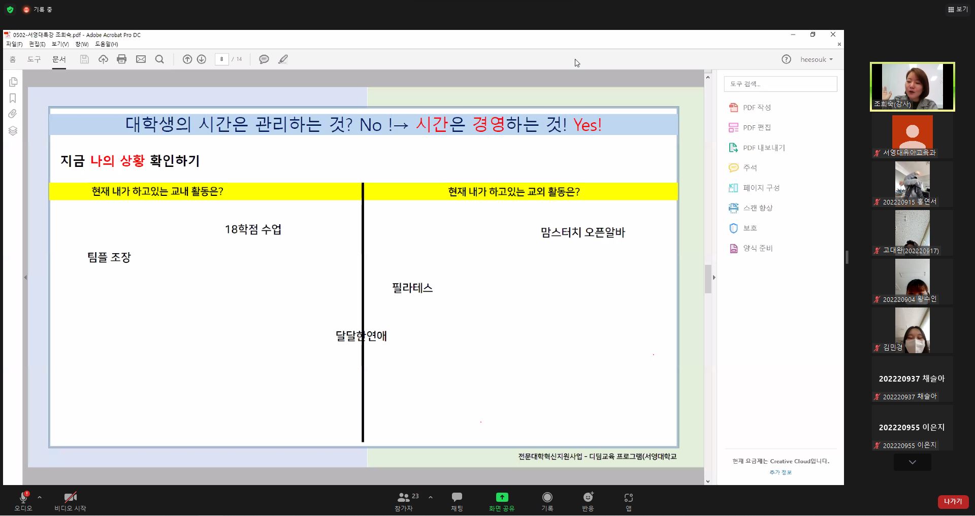 - 내용 : 현재 자신 하고있는 교내·외활동이 무엇인지 생각하며 지금 나의 상황에 대해 확인해보는 시간을 가졌습니다. 이후에 활동의 중요한 정도, 급한 정도를 비교하여 나타낸 '활동 중요도 메트릭스'를 그려보고 이야기 나누며 특강을 마무리하였습니다.