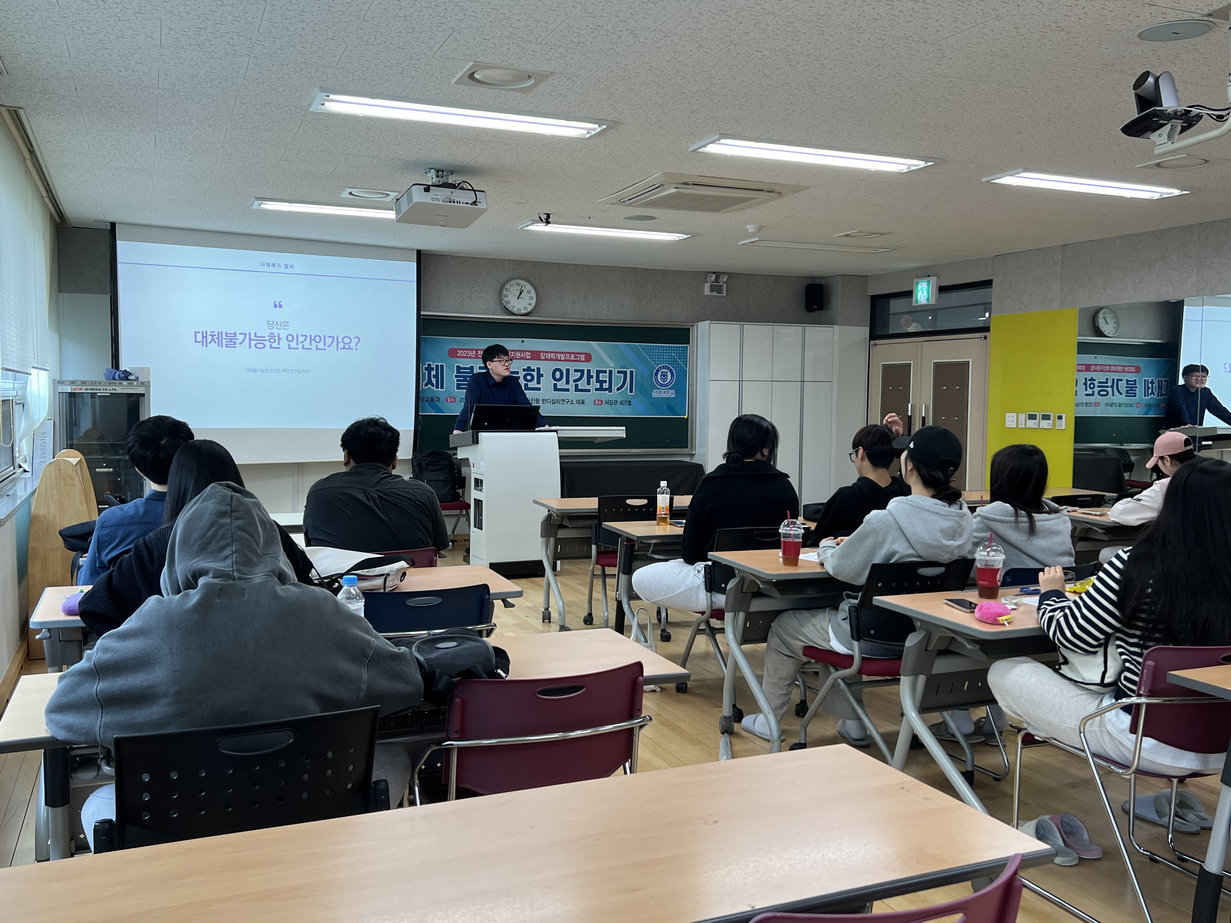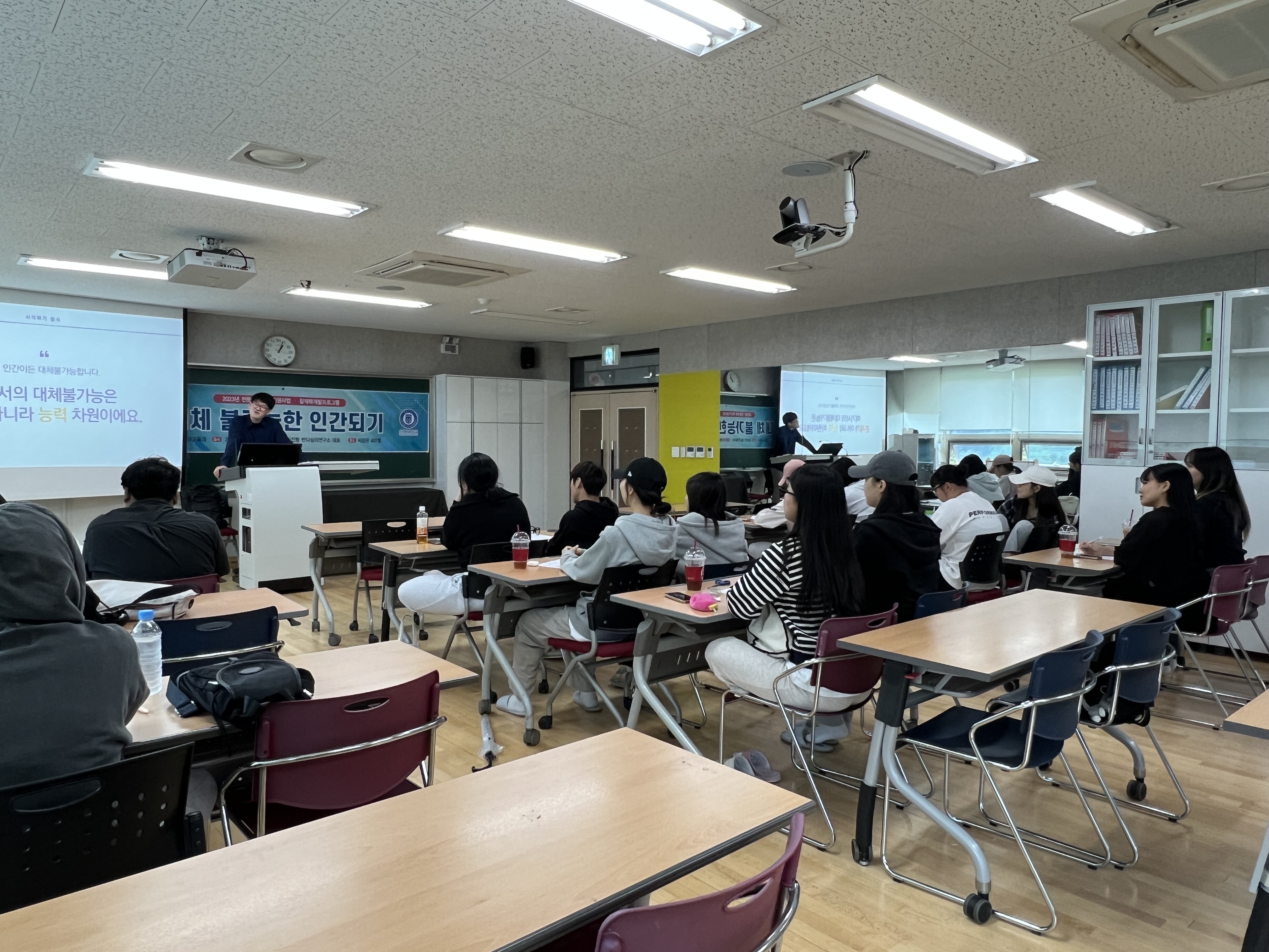- 내용 : "어떤 인간이든 대체 불가능하다" 여기서 대체불가능은 존재가 아니라 능력의 차원이다. 특강을 통해 내면에 존재하고 있는 존재적 불안감, 창의력, 학습화된 무기력, 자기결정론, 상상력 등에 대해 이야기를 나누었다. 일방적인 강의식 특강이 아닌 학생들과의 소통을 중요시하며, 개방적 발문으로 질문에 대한 다양한 답들을 유도하여 특강을 진행해주셔서 스스로의 내면을 생각해보고 이해할 수 있는 계기가 되었다.