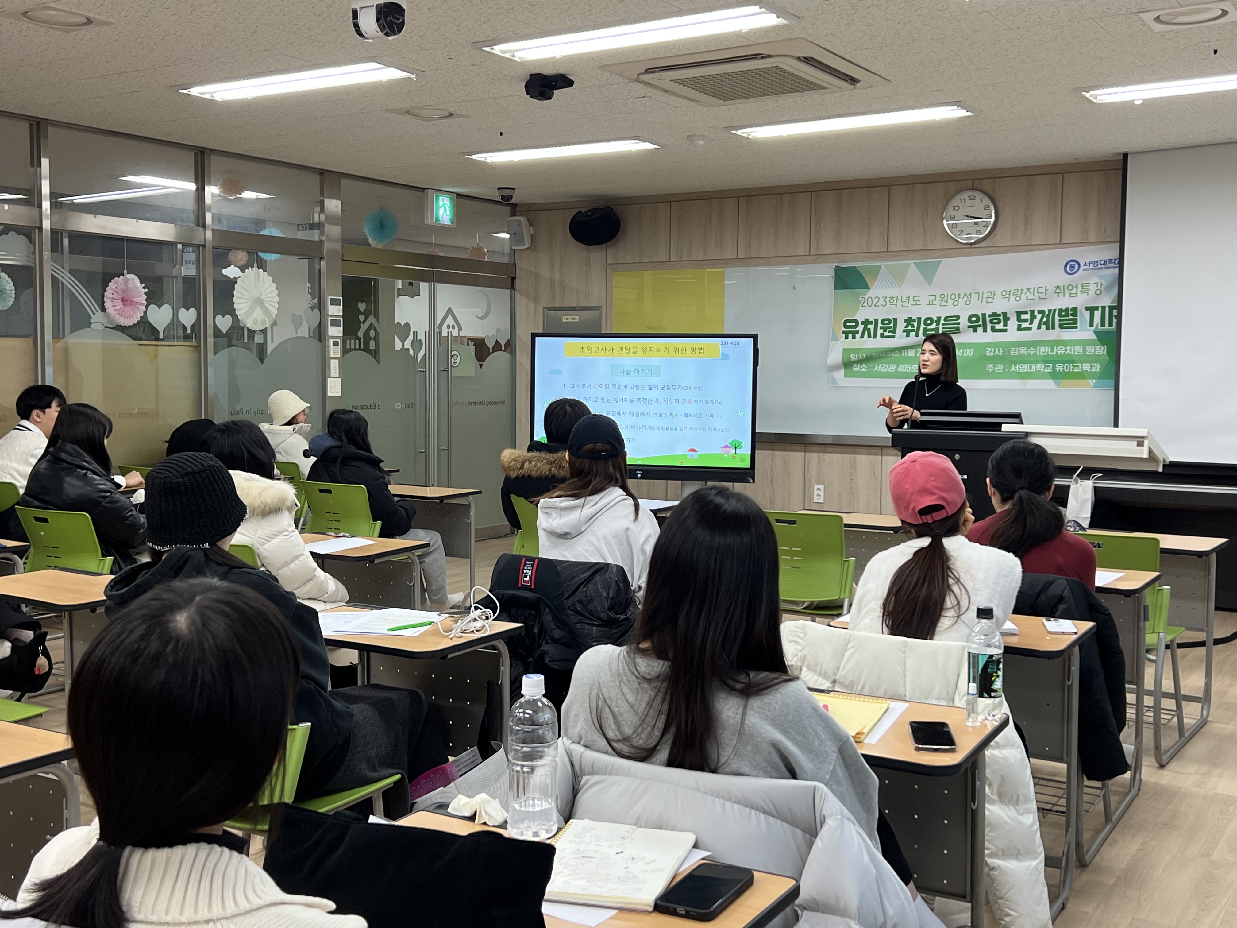 - 내용 : 유아교육과 3학년 재학생을 대상으로 유아교육기관 원장님께서 취업과 관련된 내용들을 정리하여 알려주셨고, 학생들과의 질의응답 시간을 가져 궁금증을 해소해주셨습니다.
