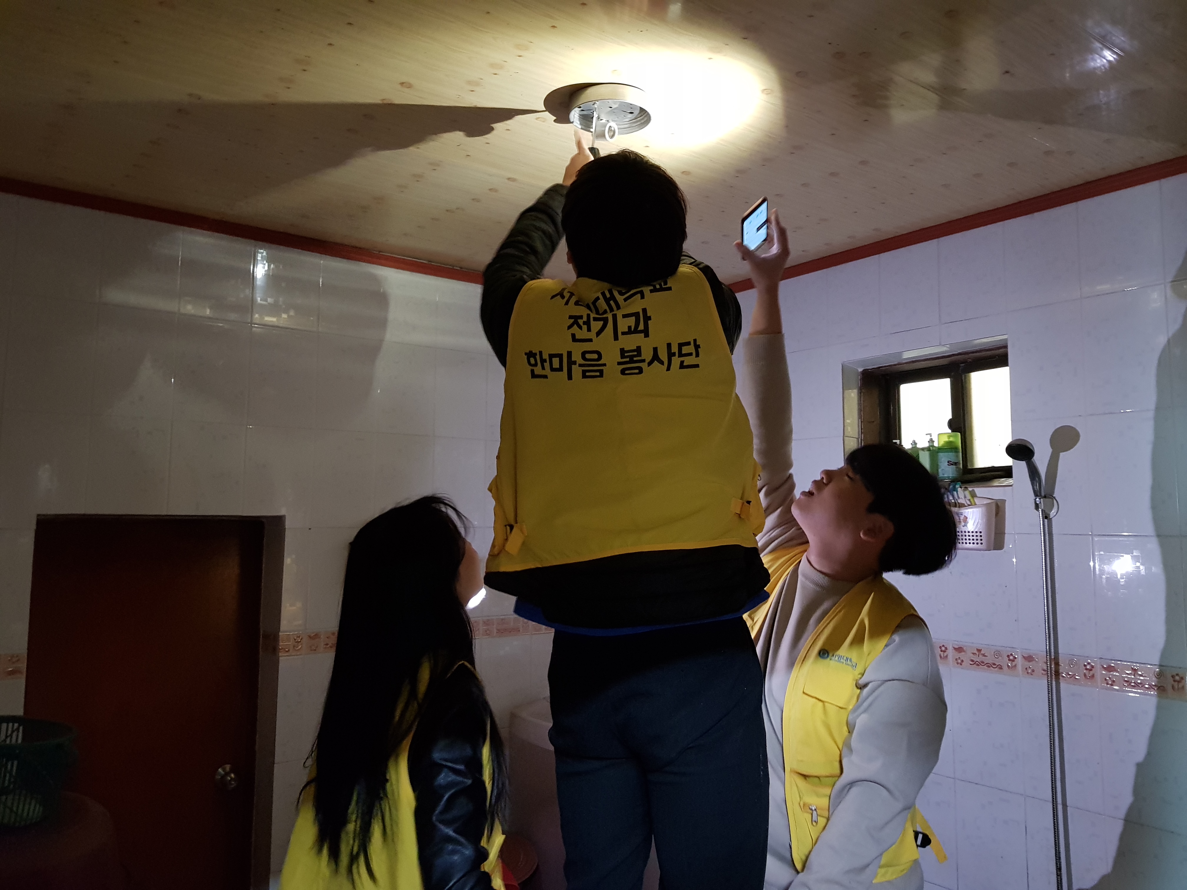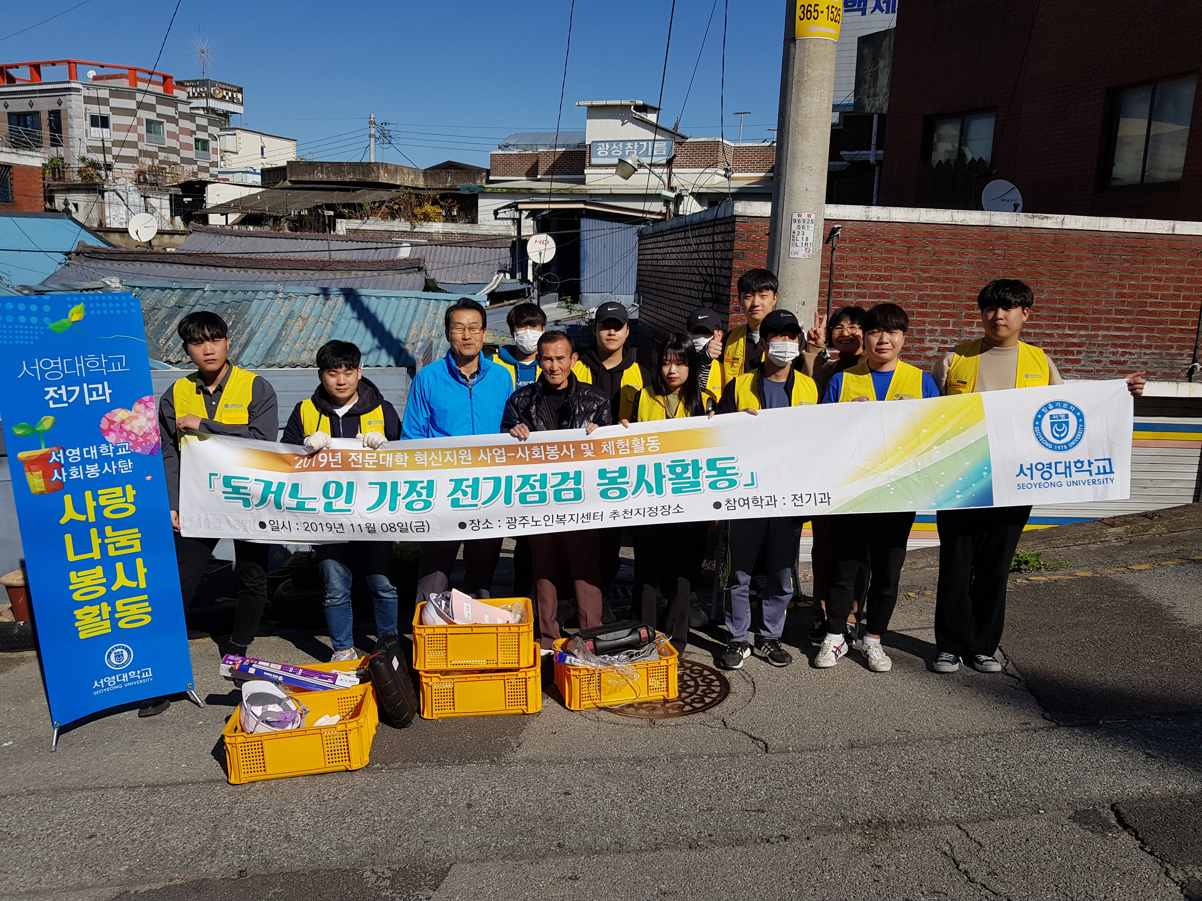 서영대학교 전기과, 독거노인 전기 봉사활동 서영대학교 전기과(학과장 임양수) 학생들은 지난 11월 8일 독거노인 및 노약자 어르신 가정에서 전기 봉사활동을 벌였다. 이날 봉사활동은 지난 2015년부터 수년간 계속되고 있는 전기 점검 봉사활동으로, 노약자 어르신 가정의 전기코드선 정리 및 누전 점검, 노후 전기 설비 교체로 지역사회의 호응을 받고 있다. 김효은 전기과 학회장은 “힘들고 의지할 곳 없는 독거노인 가정에서 전기 점검봉사활동을 펼치는 과정에서 노인에 대한 공경과 전기과 전공에 대한 자긍심을 얻었고 어둠속에서 사회를 빛나게 하는 등불의 정신을 갖게 되는 기회가 됐다”고 말하고 졸업 후에도 후배들과 계속하여 참여하겠다고 다짐했다.
