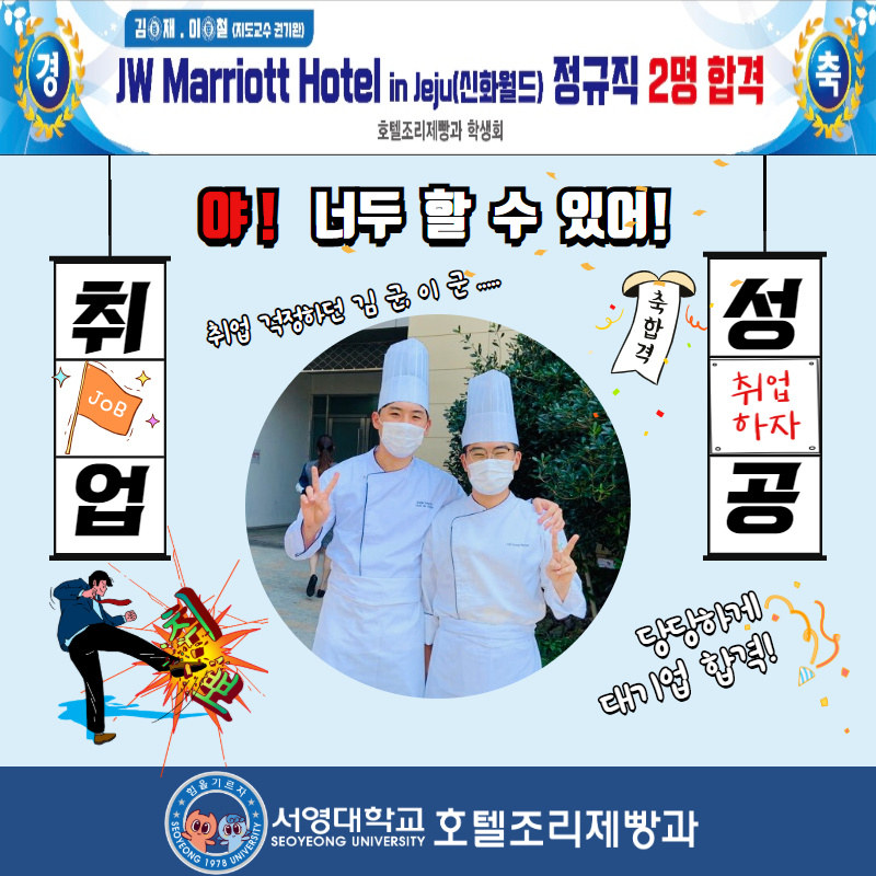 호텔조리제빵과 2학년에 재학중인 김0재, 이0철 학생들이 JW Marriott Hotel in JeJu에서 산학실습을 마치고, 연계 취업으로 정직원에 합격하였습니다.