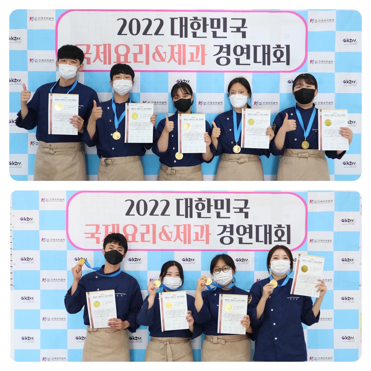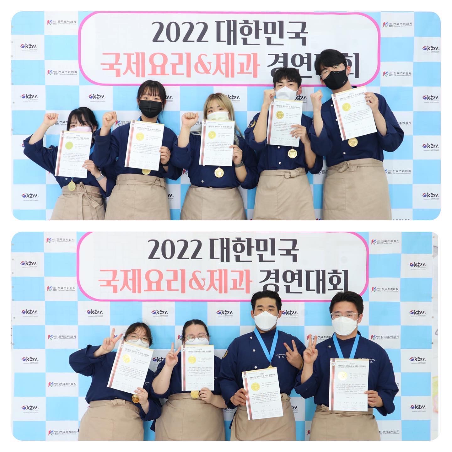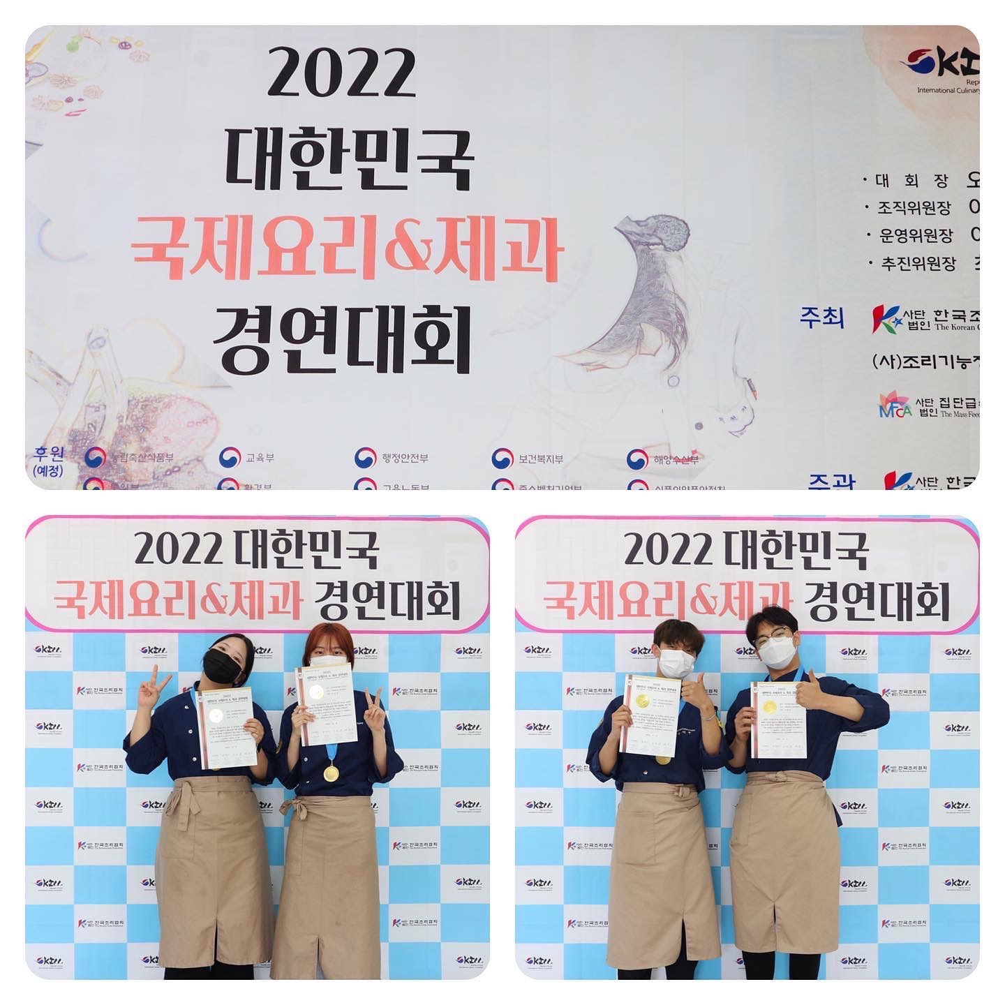 ○ 호텔조리제빵과(학과장 권기완) 학생들은 2022 대한민국 국제요리&제과 경연대회에 참가해 우수한 성적으로 대상, 최우수상, 장려상, 금상, 은상전원이 수상하는 쾌거를 이루었다.