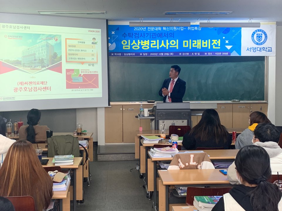 임상병리과에서는 2020년 3학년을 대상으로 취업역량을 강화하기 위한 혁신지원사업-취업특강을 서강관 309호 강의실에서 실시하였다. 이번 취업역량강화를 위한 특강 강사로는 주식회사 씨젠의료재단 광주호남검사센터 제 2지점을 맡고 있는 조O일 지점장님께서 바쁘신 일정에도 불구하고 강사로 참여하였으며, 우리대학 임상병리과 3학년을 위해 취업역량강화를 위한 자기관리 방법과, 직장생활에서의 대인관계요령, 대화의 기술 등 관련 사례를 중심으로 소개하였며, 앞으로 임상병리 검사실의 취업 비전과 수탁검사기관의 상호 보완을 위한 노력과 방안에 대한 심도있는 특강으로 많은 학생들에게 관심있는 취업특강이 되었다는 평가다.