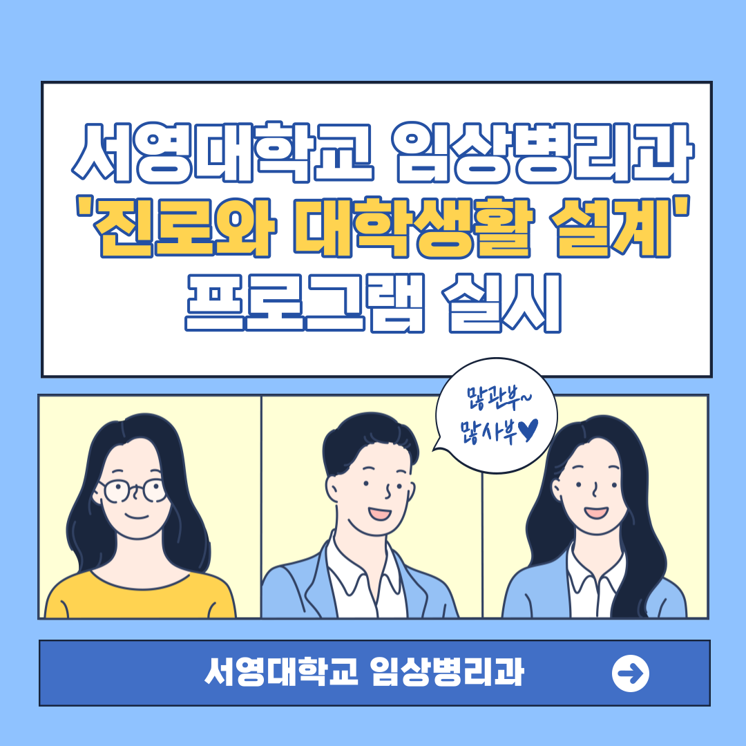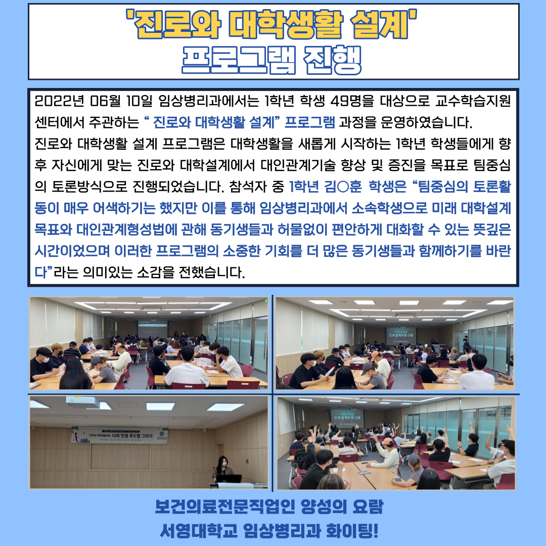 2022년 06월 10일 임상병리과에서는 1학년 학생 49명을 대상으로 교수학습지원센터에서 주관하는 “진로와 대학생활 설계” 프로그램 과정을 운영하였습니다. 진로와 대학생활 설계 프로그램은 대학생활을 새롭게 시작하는 1학년 학생들에게 향후 자신에게 맞는 진로와 대학설계에서 대인관계기술 향상 및 증진을 목표로 팀중심의 토론방식으로 진행되었습니다. 참석자 중 1학년 김○훈 학생은 “팀중심의 토론활동이 매우 어색하기는 했지만 이를 통해 임상병리과에서 소속학생으로 미래 대학설계 목표와 대인관계형성법에 관해 동기생들과 허물없이 편안하게 대화할 수 있는 뜻깊은 시간이었으며 이러한 프로그램의 소중한 기회를 더 많은 동기생들과 함께하기를 바란다”라는 의미있는 소감을 전했습니다.
