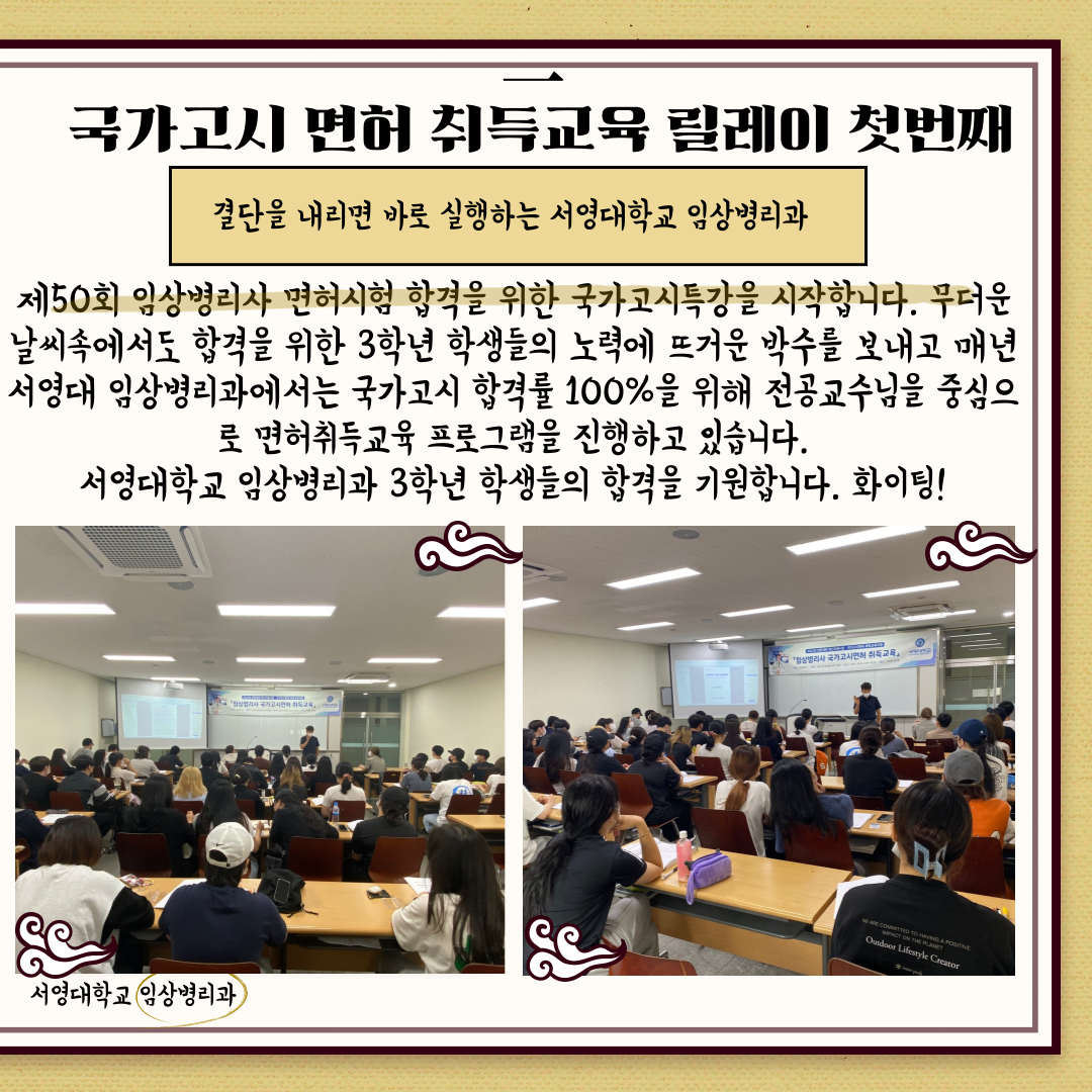 제 50회 임상병리사 면허시험 합격을 위한 국가고시특강을 시작합니다. 무더운 날씨속에서도 합격을 위한 3학년 학생들의 노력에 뜨거운 박수를 보내고 매년 서영대 임상병리과에서는 국가고시 합격률 100%을 위해 전공교수님을 중심으로 면허취득교육 프로그램을 진행하고 있습니다. 서영대학교 임상병리과 3학년 학생들의 합격을 기원합니다. 화이팅!