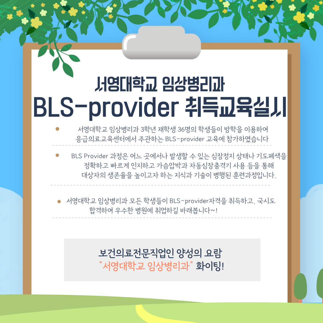 서영대학교 임상병리과 3학년 재학생 36명의 학생들이 방학을 이용하여 응급의료교육센터에서 주관하는BLS-provider교육에 참가 하였습니다. BLS Provider과정은 어느 곳에서나 발생할 수 있는 심장정지 상태나 기도폐색을 정확하고 빠르게 인지하고 가슴압박과 자동심장충격기 사용 등을 통해 대상자의 생존율을 높이고자 하는 지식과 기술이 병행된 훈련과정입니다.서영대학교 임상병리과BLS-provider자격을 취득한 학생 모두가 면허 취득 후 우수한 병원에 취업했으면 좋겠습니다~!