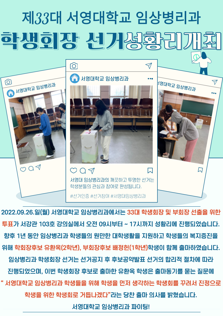2022. 09. 26.() 서영대학교 임상병리과에서는 33대 학생회장 및 부회장 선출을 위한 투표가 서강관 103호 강의실에서 오전 09~ 17시까지 성황리에 진행되었습니다. 향후 1년 동안 임상병리과 학생들의 원만한 대학생활을 지원하고 학생들의 복지증진을 위해 학회장후보 유환옥(2학년), 부회장후보 배정헌(1학년)학생이 함께 출마하였습니다. 임상병리과 학생회장 선거는 선거 공지 후 후보공약발표 선거의 합리적 절차에 따라 진행되었으며, 이번 학생회장 후보로 출마한 유환옥 학생은 출마동기를 묻는 질문에 서영대학교 임상병리과 학생들을 위해 학생을 먼저 생각하는 학생회를 꾸려서 진정으로 학생을 위한 학생회로 거듭나겠다.”라는 당찬 출마 의사를 밝혔습니다. 서영대학교 임상병리과 파이팅!
