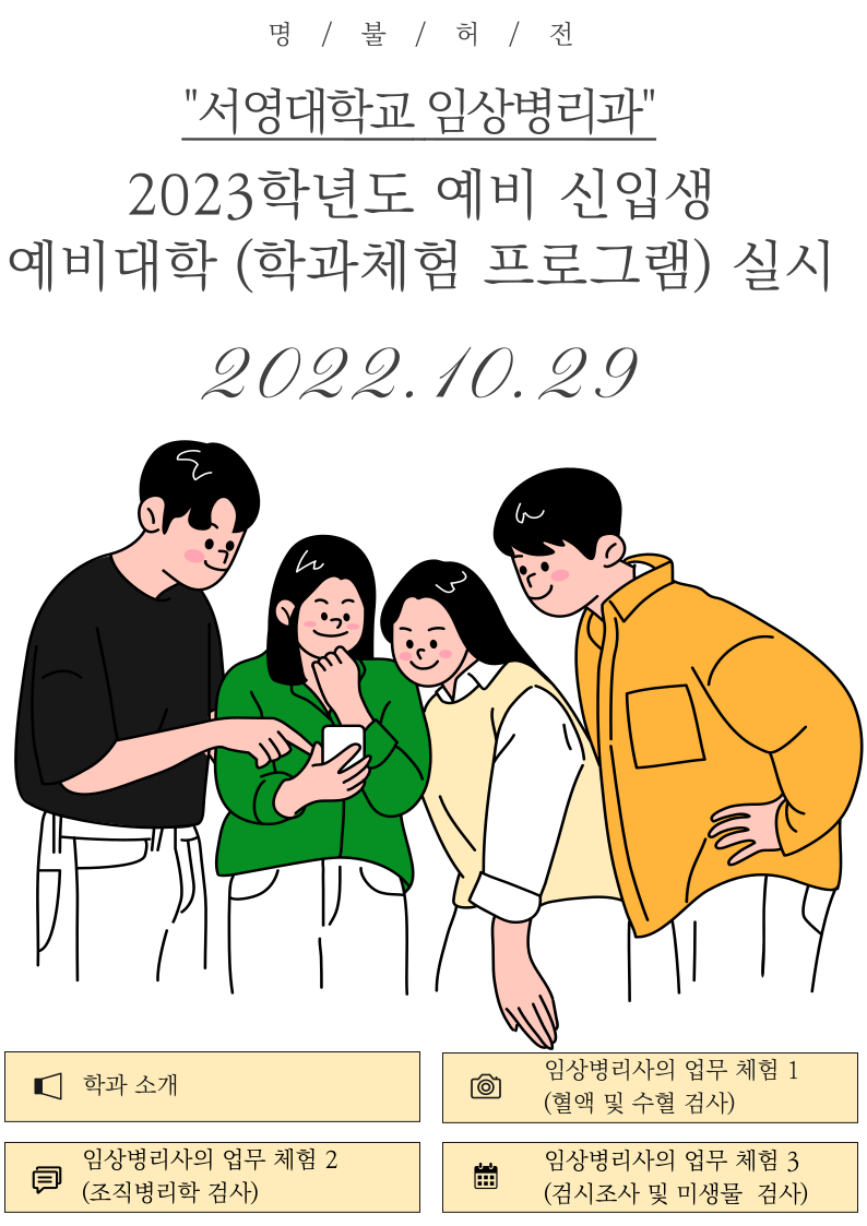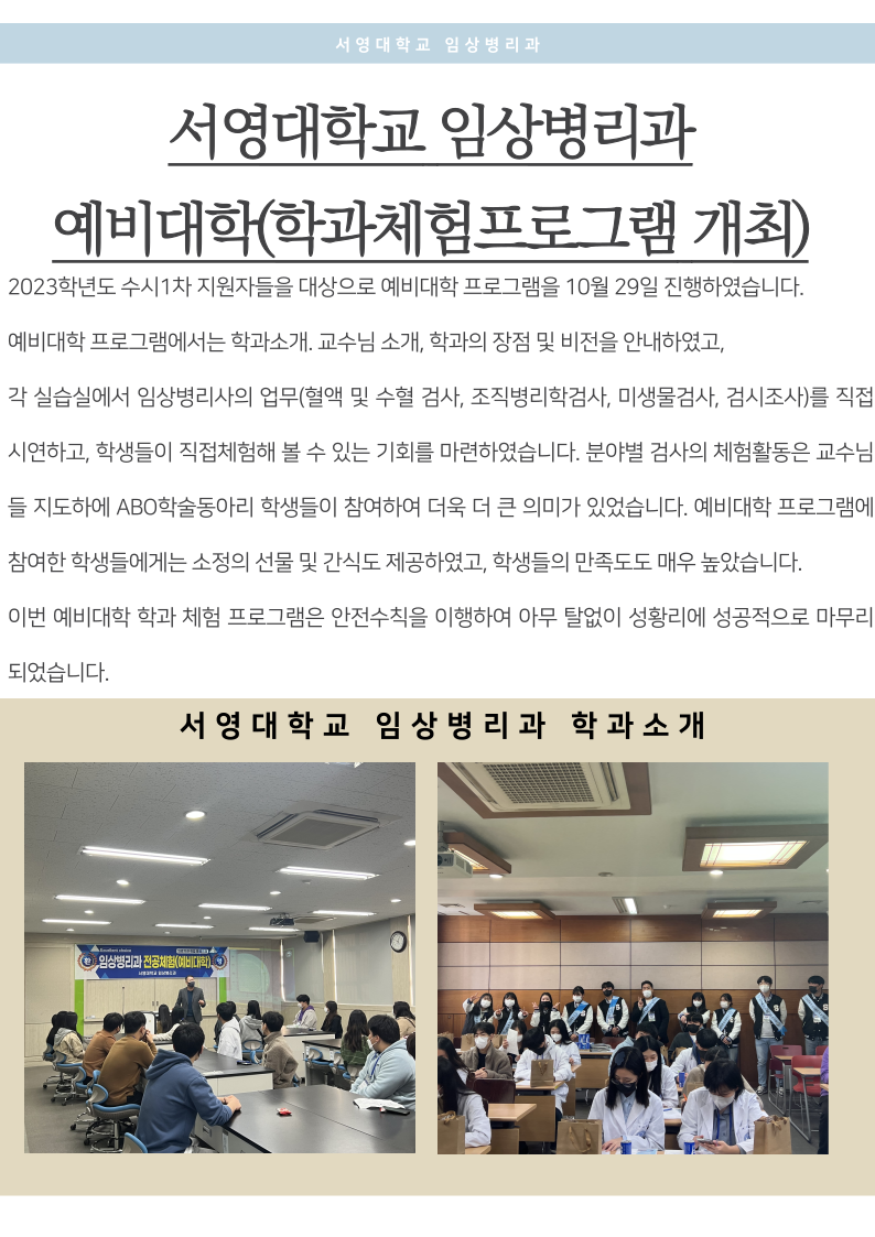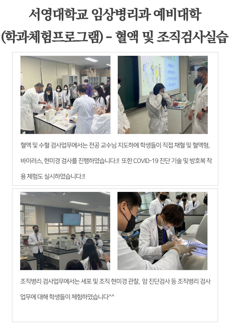 각 실습실에서 임상병리사의 업무(혈액 및 수혈 검사, 조직병리학검사, 미생물검사, 검시조사)를 직접 시연하고, 학생들이 직접 체험해 볼 수 있는 기회를 마련하였습니다. 분야별 검사의 체험활동은 교수님들 지도하에 ABO 학술동아리 학생들이 참여하여 더욱 더 큰 의미가 있었습니다. 예비대학 프로그램에 참여한 학생들에게는 소정의 선물 및 간식도 제공하였고, 학생들의 만족도도 매우 높았습니다. 이번 예비대학 학과 체험 프로그램은 안전수칙을 이행하여 아무 탈 없이 성황리에 성공적으로 마무리 되었습니다. 참여해주신 학생분들 에게 진심으로 감사드리며, 이번 예비대학 프로그램 진행 준비부터 마무리까지 고생하신 학과교수님들, 학생회 임원진들, 참여한 ABO 학술동아리 학생들 모두 감사드리고, 수고하셨습니다. 서영대학교 임상병리과 화이팅!!!