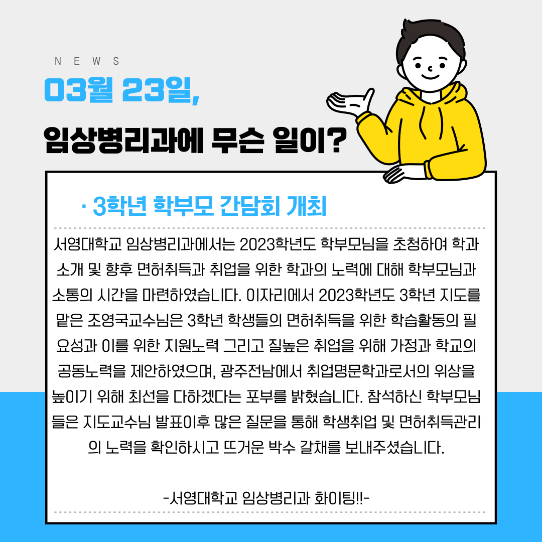 서영대학교 임상병리과에서는 2023학년도 학부모님을 초청하여 학과 소개 및 향후 면허취득과 취업을 위한 학과의 노력에 대해 학부모님과 소통의 시간을 마련하였습니다. 이 자리에서 2023학년도 3학년 지도를 맡은 조영국 교수님은 3학년 학생들의 면허취득을 위한 학습활동의 필요성과 이를 위한 지원노력 그리고 질높은 취업을 위해 가정과 학교의 공동노력을 제안하였으며 광주전남에서 취업명문학과로서의 위상을 높이기 위해 최선을 다하겠다는 포부를 밝혔습니다. 참석하신 학부모님들은 지도교수님 발표이후 많은 질문을 통해 학생취업 및 면허취득관리의 노력을 확인하시고 뜨거운 박수 갈채를 보내주셨습니다. 서영대학교 임상병리과 화이팅♡