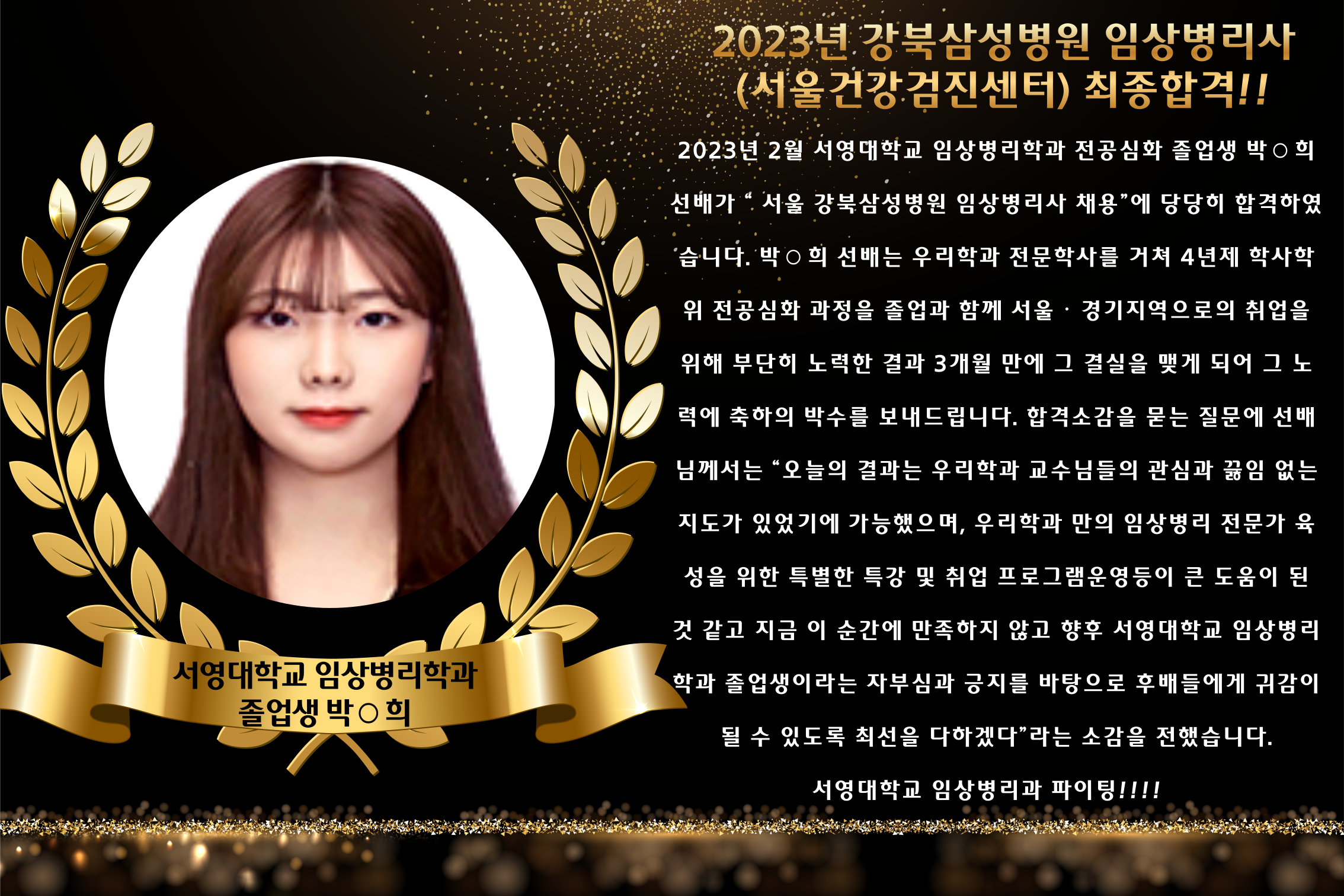 2023년 2월 서영대학교 임상병리학과 전공심화 졸업생 박○희 선배가 “ 서울 강북삼성병원 임상병리사 채용”에 당당히 합격하였습니다. 박○희 선배는 우리학과 전문학사를 거쳐 4년제 학사학위 전공심화 과정을 졸업과 함께 서울‧경기지역으로의 취업을 위해 부단히 노력한 결과 3개월 만에 그 결실을 맺게 되어 그 노력에 축하의 박수를 보내드립니다. 합격소감을 묻는 질문에 선배님께서는 “오늘의 결과는 우리학과 교수님들의 관심과 끓임 없는 지도가 있었기에 가능했으며, 우리학과 만의 임상병리 전문가 육성을 위한 특별한 특강 및 취업 프로그램운영등이 큰 도움이 된 것 같고 지금 이 순간에 만족하지 않고 향후 서영대학교 임상병리학과 졸업생이라는 자부심과 긍지를 바탕으로 후배들에게 귀감이 될 수 있도록 최선을 다하겠다”라는 소감을 전했습니다. 서영대학교 임상병리과 파이팅!!!!