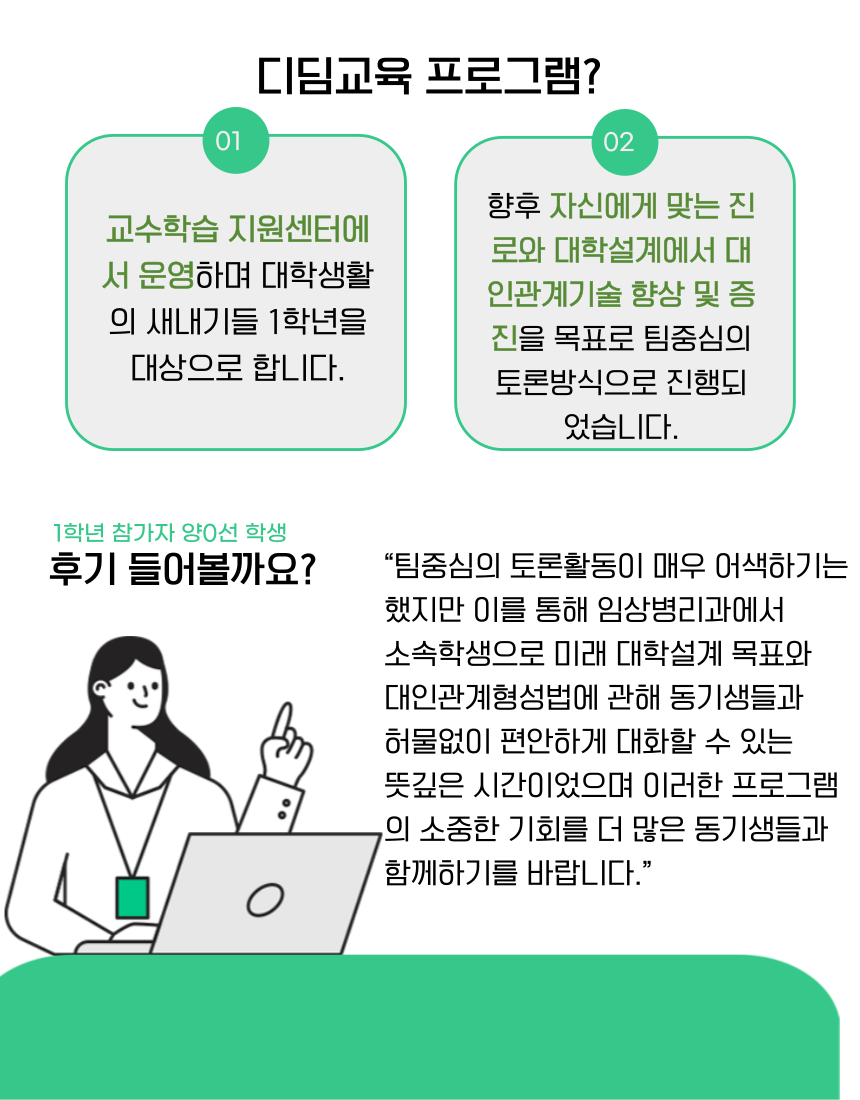 교수학습 지원센터에서 운영하며 대학생활의 새내기들 1학년을 대상으로 합니다. 향후 자신에게 맞는 진로와 대학설계에서 대인관계기술 향상 및 증진을 목표로 팀중심의 토론방식으로 진행되었습니다. 참가한 양○선 학생은 “팀중심의 토론활동이 매우 어색하기는