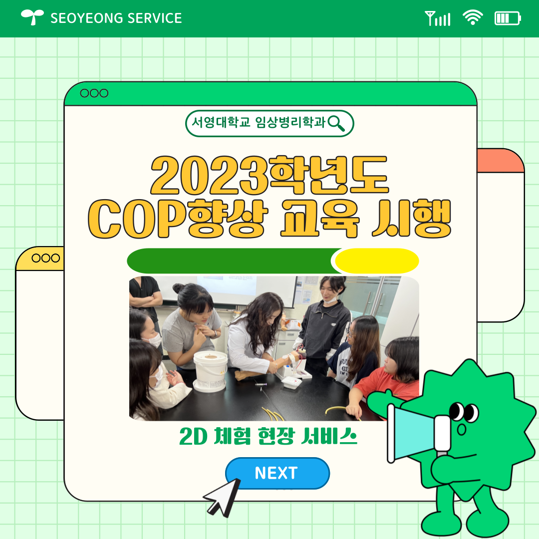 서영대학교 임상병리학과에서는 재학생들의 학생들의 방과 후 학습동아리 형태의 COP (Community of Practice)를 운영하고 있습니다. 올해에는 혈액학 실습 교과목을 가지고 조선대학교 ○○○ 교수님께서 강의를 진행하여 주셨고 직접 실습을 해볼수 있는 기회를 가졌습니다. 향후 학과에서는 임상병리학과 재학생들의 다양한 비교과프로그램 활성화를 목표로 지속적이고 질적인 프로그램운영의 활성화를 모색할 계획입니다.