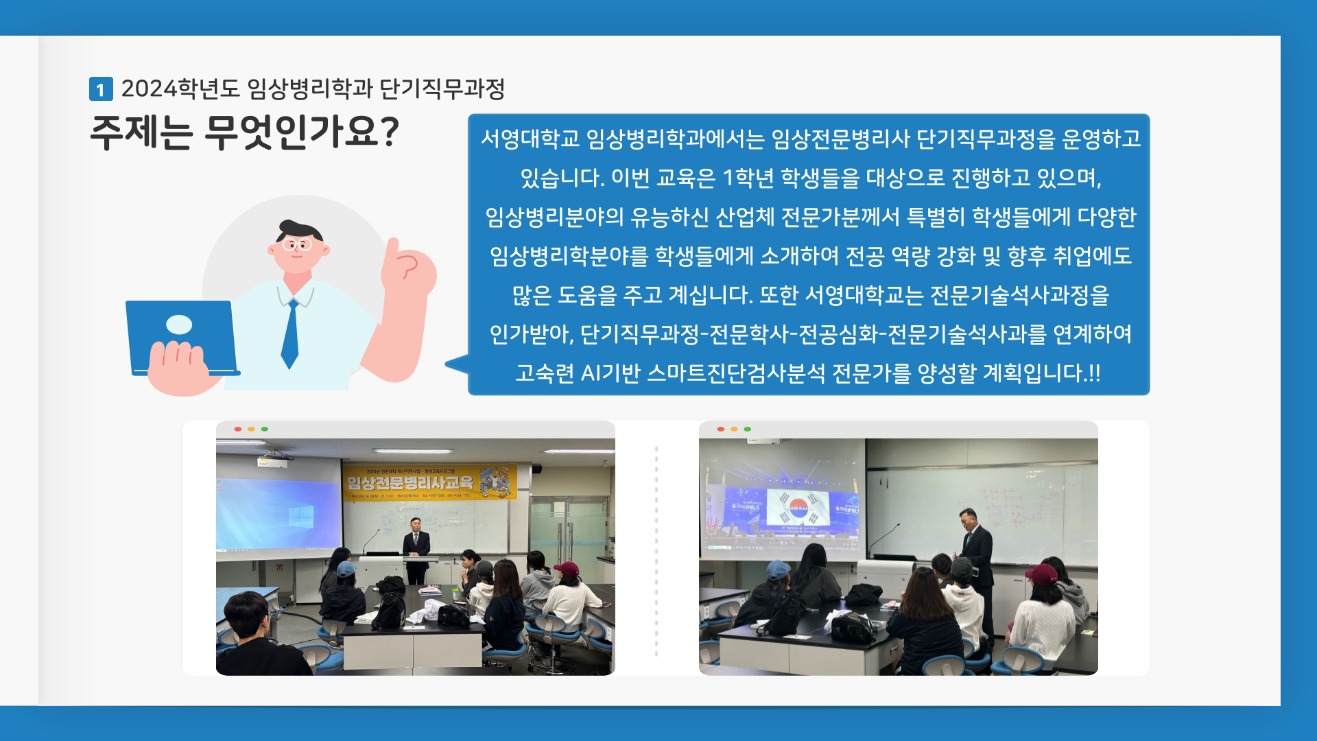 서영대학교 임상병리학과에서는 임상전문병리사 단기직무과정을 운영하고 있습니다. 이번 교육은 1학년 학생들을 대상으로 진행하고 있으며, 임상병리분야의 유능하신 산업체 전문가 분께서 특별히 학생들에게 다양한 임상병리학분야를 학생들에게 소개하여 전공 역량 강화 및 향후 취업에도 많은 도움을주고 계십니다. 또한 서영대학교는 전문기술석사과정을 인가받아, 단기직무과정-전문학사-전공심화-전문기술석사과정를 연계하여 고숙련 AI기반 스마트진단검사분석 전문가를 양성할 계획입니다.!!