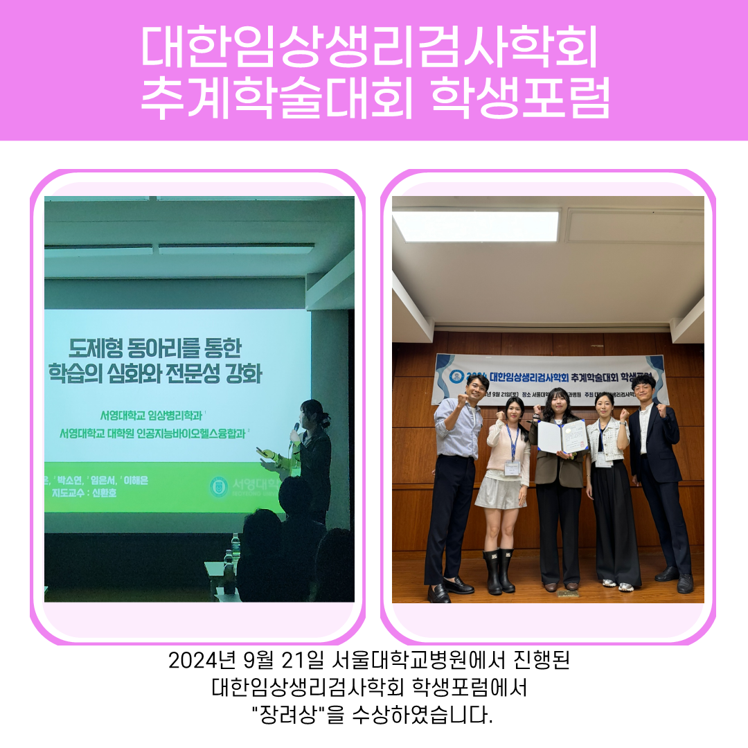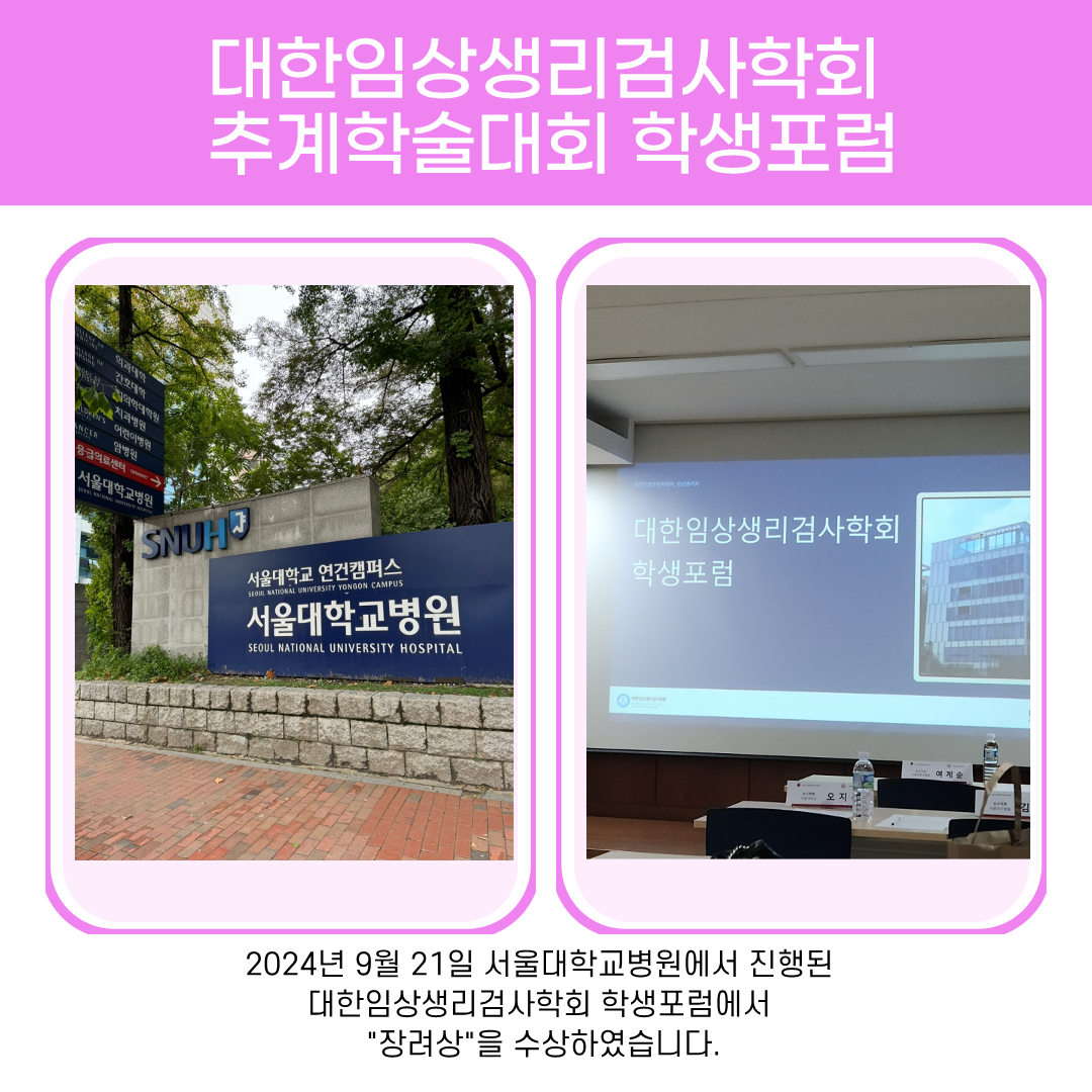 우리대학 임상병리학과가 서울대학교병원에서 개최된 대한임상생리검사학회 학생포럼에 참가해 장려상을 수상하였습니다.