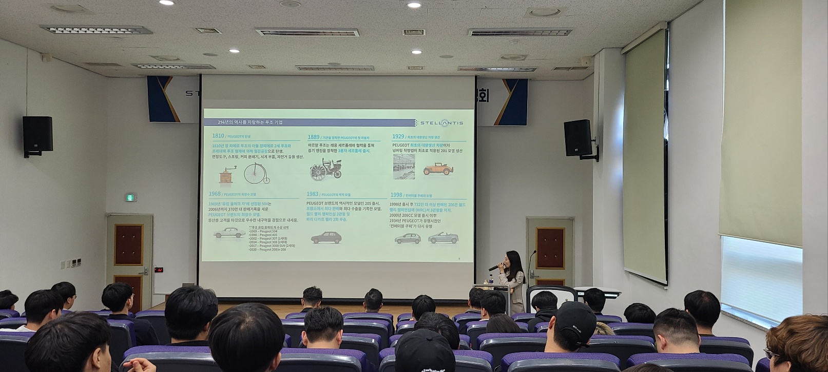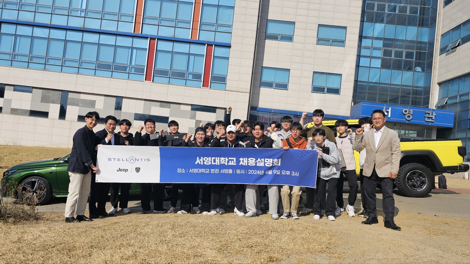 서영대학교 파주캠퍼스 미래자동차과 2024년 4월9일(화) 서영관 서영홀에서 스텔란티스 코리아는 서영대학교와 전국 최초로 신입사원 채용설명회를 진행 하였습니다. 서영대학교 서영관 서영홀에서 진행된 신입사원 채용 설명회에 스텐란티스 코리아 윤O로 이사님참석, 인천, 일산, 서울 딜러사 인사팀 팀장님 참석하셨으며 서영대학교 미래자동차과 재학생 60여명이 참석하여 채용준비에 대한 많은 질의로 뜨거운 채용설명회가 되었고, 특히 채용설명회 이후 스텔란티스 대표 브랜드 지프와 푸조 차량을 시승해 보는 시간을 가져 재학생들의 많은 관심과 호응을 받았다. 스텔란티스 코리아에는 산하 14개의 브랜드 : 지프, 푸조, 시트로앵, DS오토모빌, 피아트, 크라이슬러, 마세라티, 란치아, 알파로메오, 닷지, 아바스, 램, 오펠, 복스홀의 브랜드가 있으며 글로벌 자동차 시장에서 3~6위 안에 랭크되는 회사이며 스텔란티스의 로고는 스텔란티스를 구성하는 두 회사의 풍성한 유산, 14개의 유명 자동차 브랜드로 이루어진 강력한 포트폴리오, 그리고 세계 전역에서 근무하는 직원들의 다양한 전문성을 상징하는 스텔란티스 업체와 서영대학교와 함께 할 수 있는 길이 열릴 수 있는 길이 되길 희망 한다구 윤O로 이사님 소견을 말씀 하셨습니다.