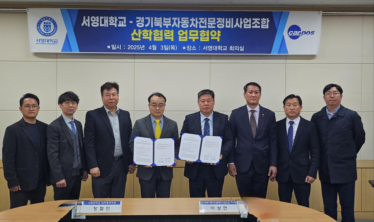 서영대학교 회의실에서 진행된 업무 협약식에는 경기북부자동차전문정비사업조합 이*언 이사장님을 비롯하여 수석 부이사장민, 부이사장님 등 관계자 분들이 참석해 자리를 빛내주셨습니다.