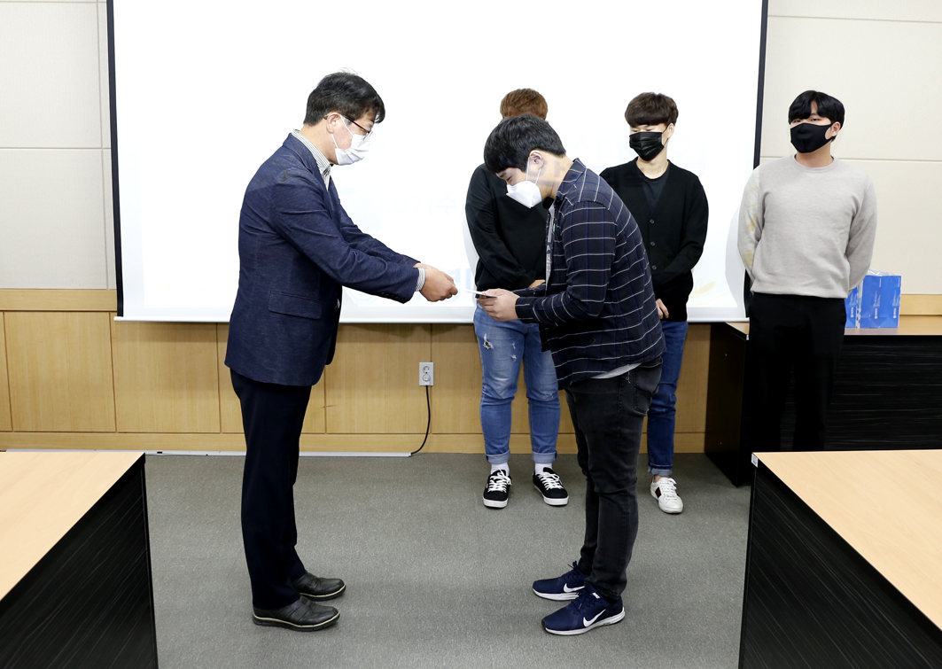 이날 , 우리과에 재학중인  신일비지니스고등학교 출신  21학번  학생 3명에게  장학금 수여식을 진행 하였다.