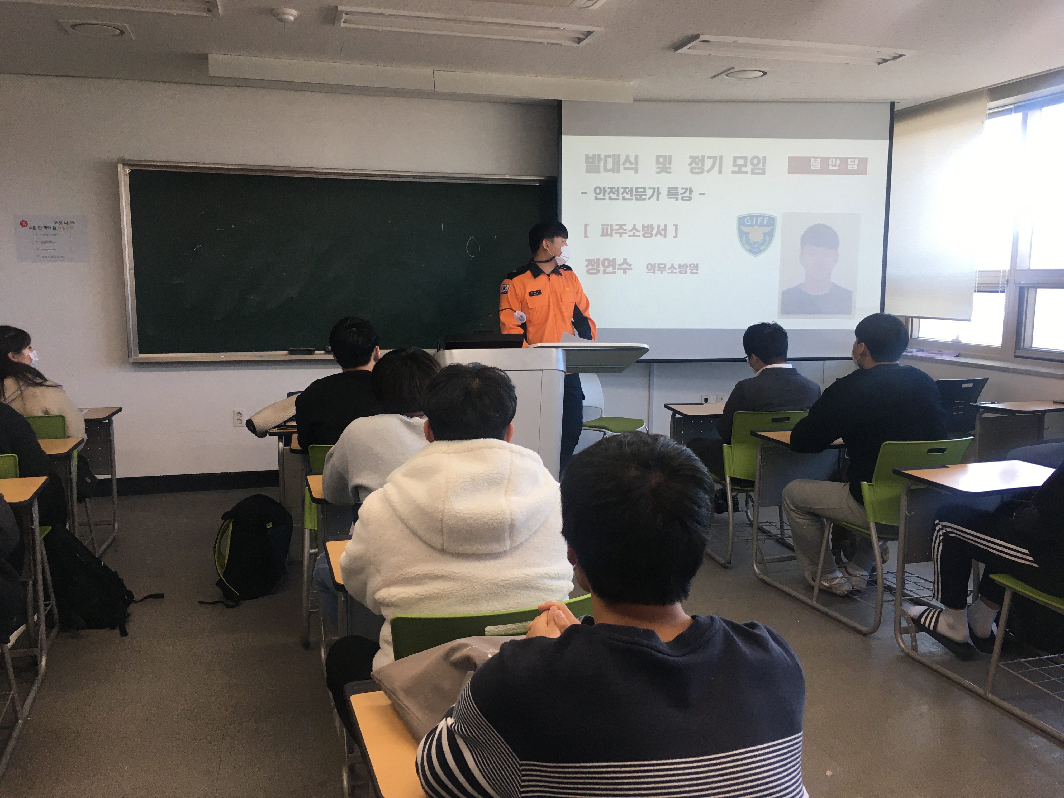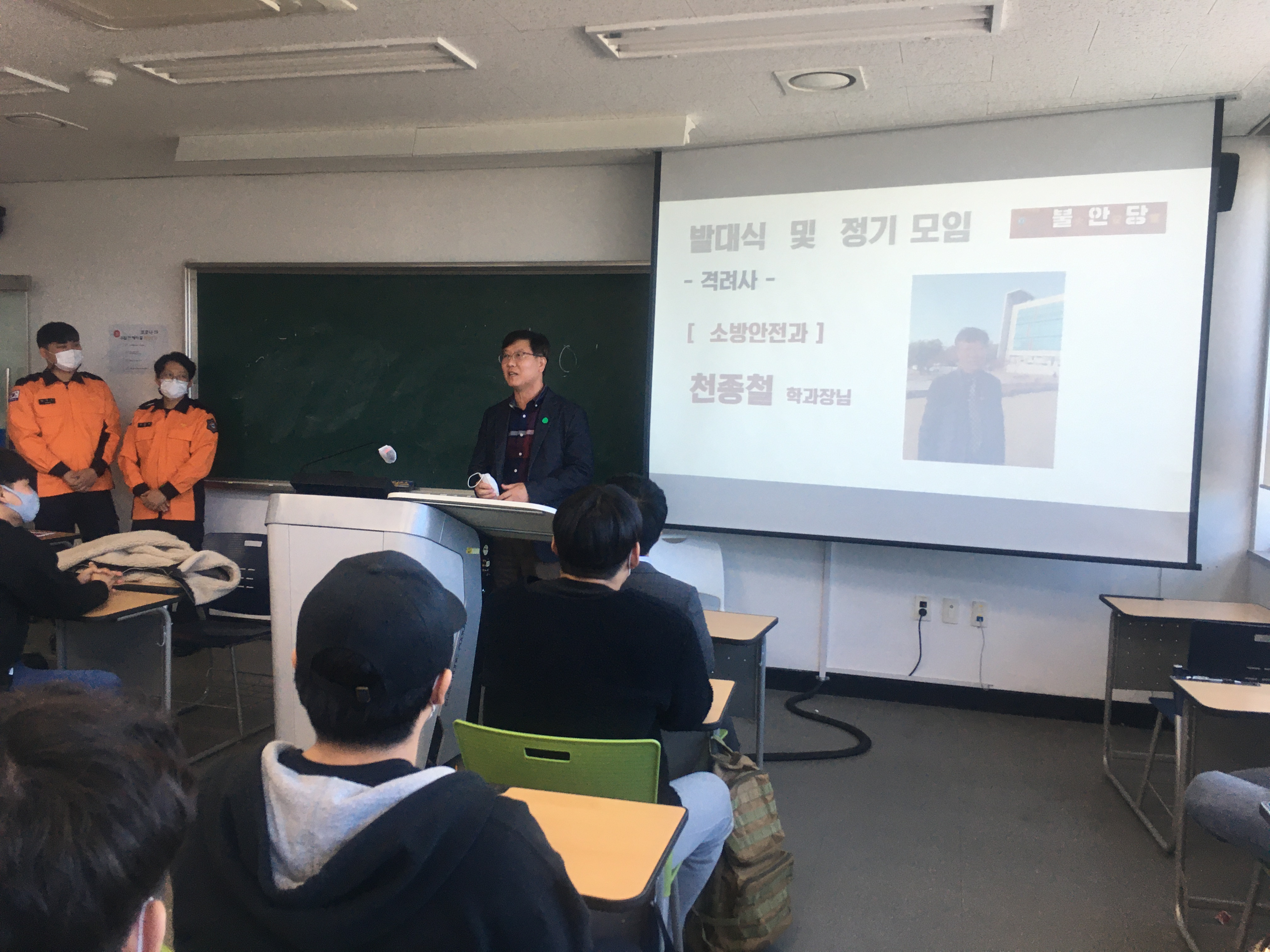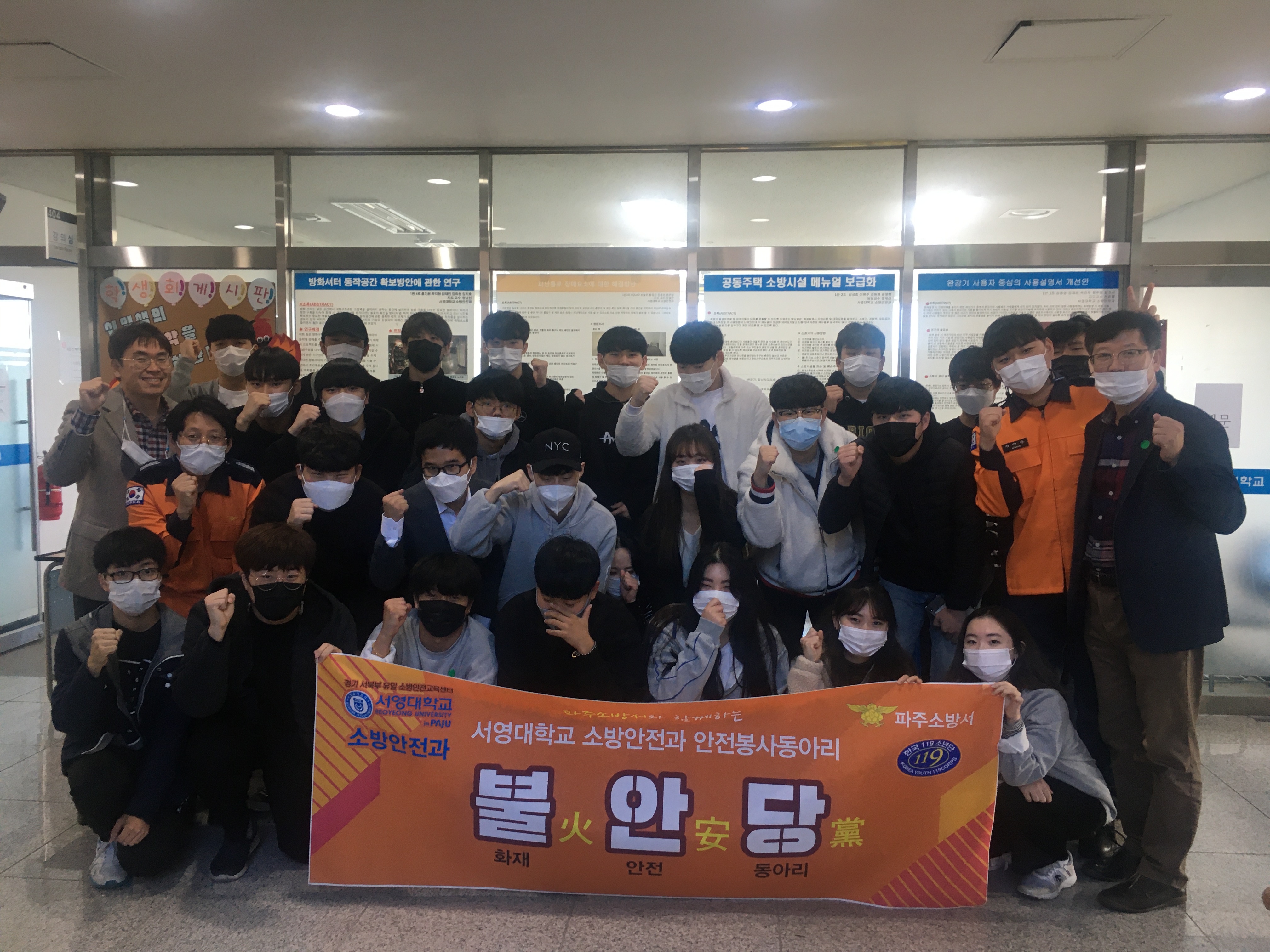 o. 소방안전과 ( 학과장 천종철) 는 28일(수) 파주소방서 재난예방과 김진수 소방장 등 파주소방서 관계자 5명과 소방안전과 교수님과 학생등 30여명이 참석한 가운데 경기서북부 최초 대학부 소방안전 봉사단 "불안당" 창단식이 열렸다. 피주소방서측에서 이날 학생들을 위해 피자 및 다과등 푸한짐 다과등을 제공해 주며 불안당 창단을 축하해 주었다.
