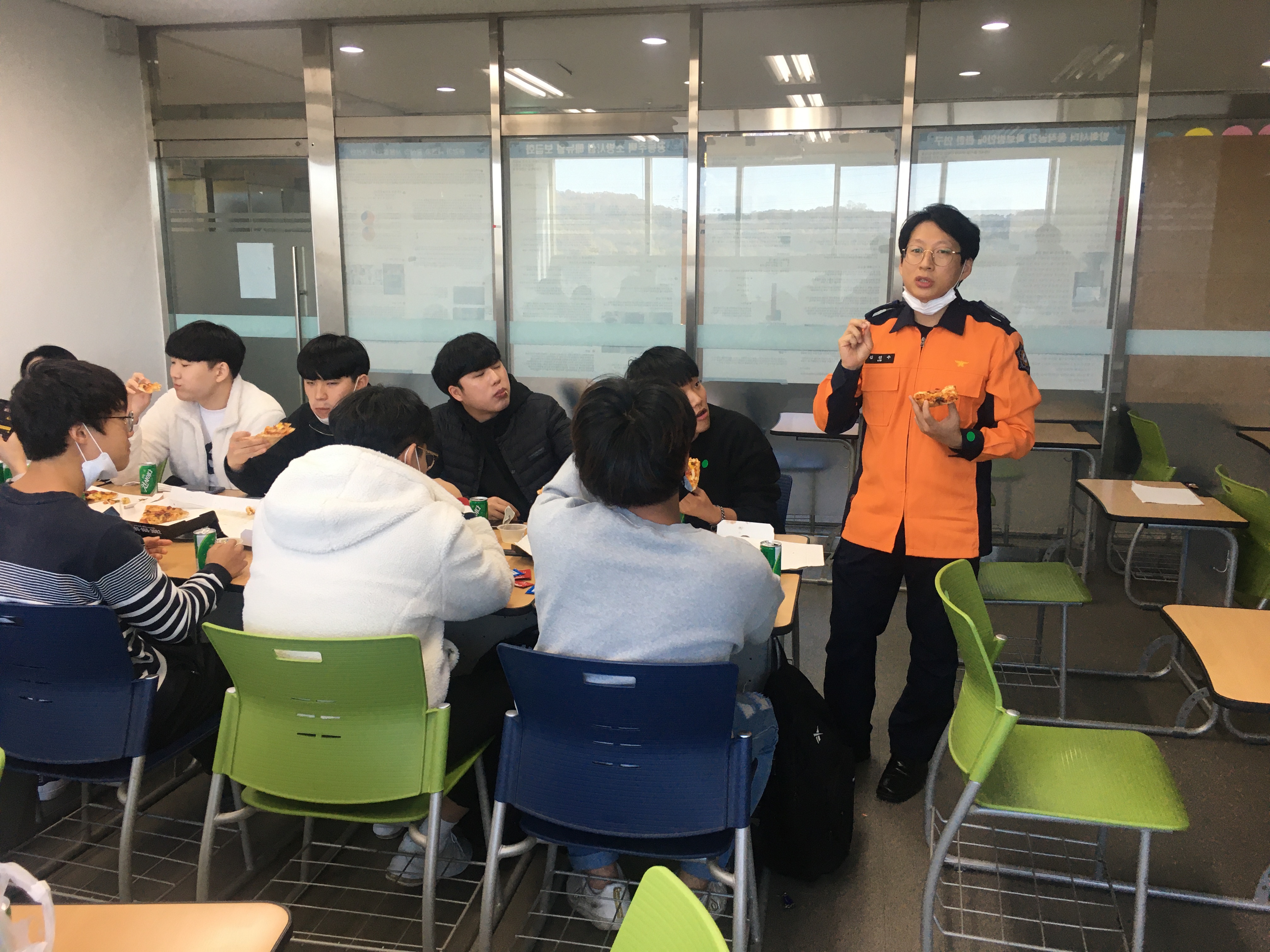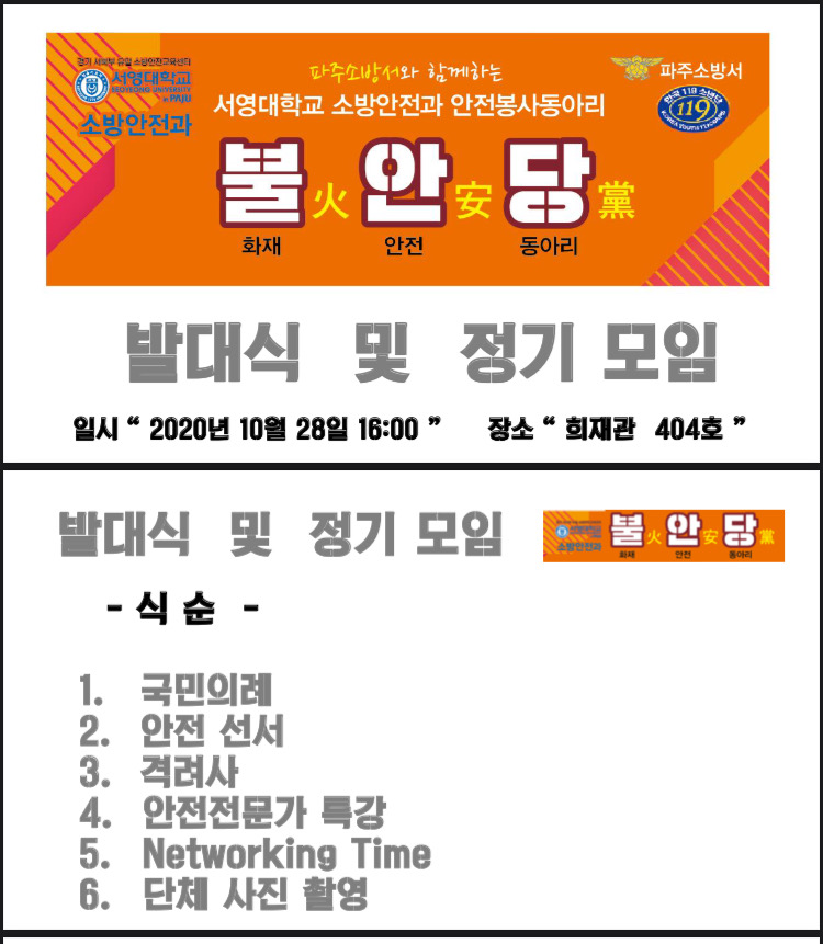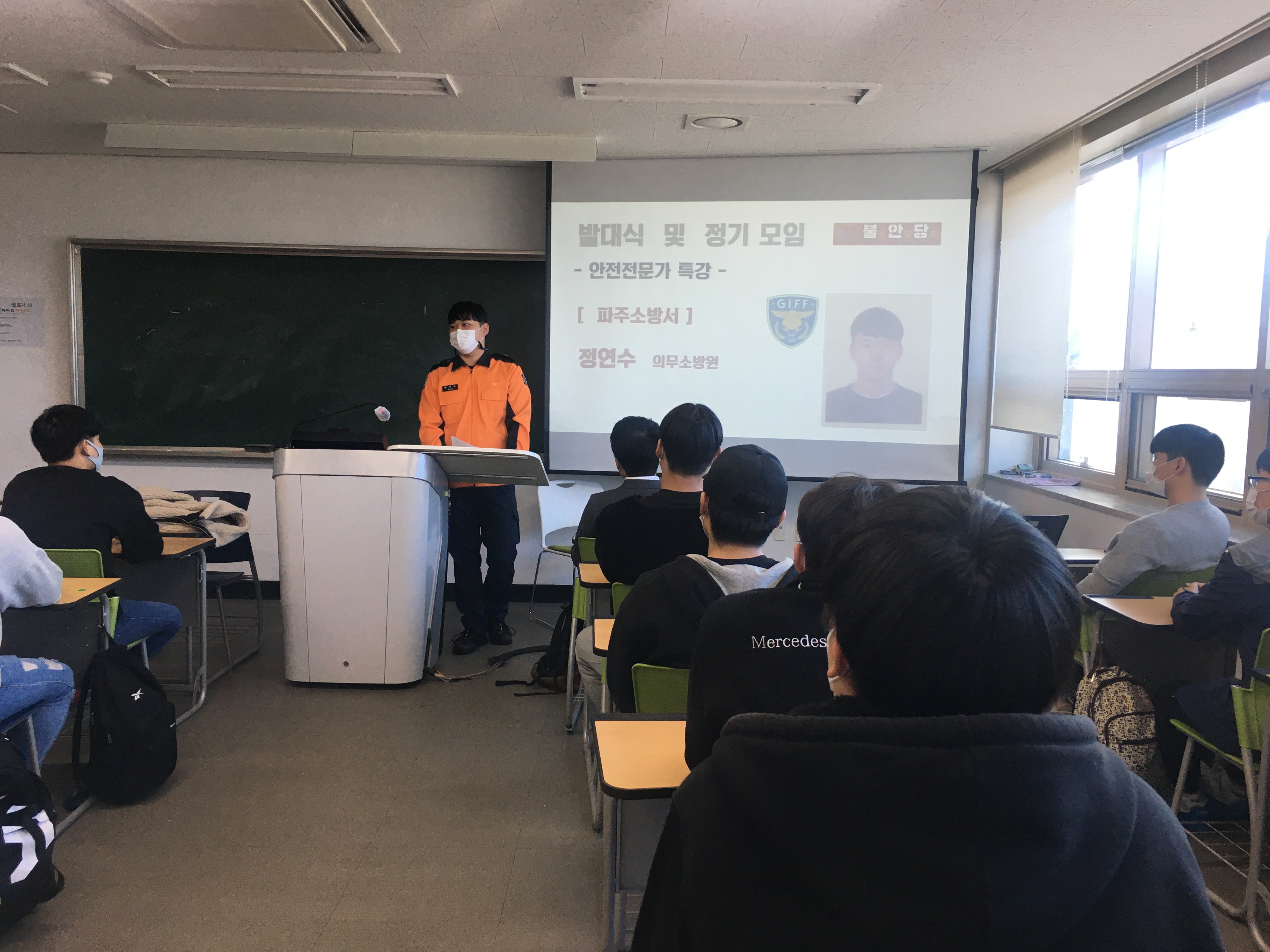 o. 소방안전과 ( 학과장 천종철) 는 28일(수) 파주소방서 재난예방과 김진수 소방장 등 파주소방서 관계자 5명과 소방안전과 교수님과 학생등 30여명이 참석한 가운데 경기서북부 최초 대학부 소방안전 봉사단 "불안당" 창단식이 열렸다. 피주소방서측에서 이날 학생들을 위해 피자 및 다과등 푸한짐 다과등을 제공해 주며 불안당 창단을 축하해 주었다.