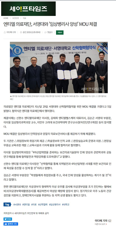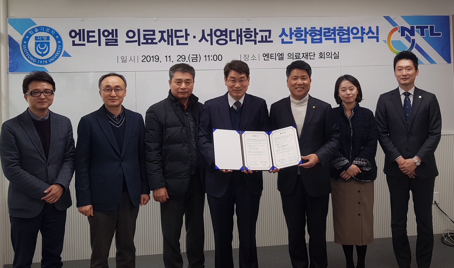 서영대학교(부총장 김순곤)는 지난 11월 29일 엔티엘 의료재단(이사장 신현수)과 산학협력협약을 위한 MOU 체결을 가졌다. 상호협력을 위해 진행된 체결식에는 서영대학교(파주) 김순곤 부총장, 임상병리학과장 이지웅 교수, 엔티엘 의료재단 이사장 신현수, (주)엔티엘헬스케어 김태희 대표이사등이 참석했다.