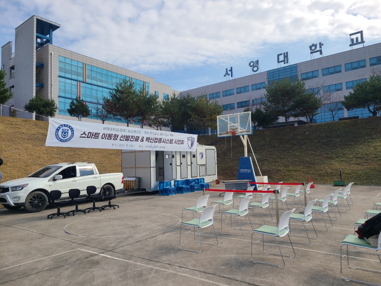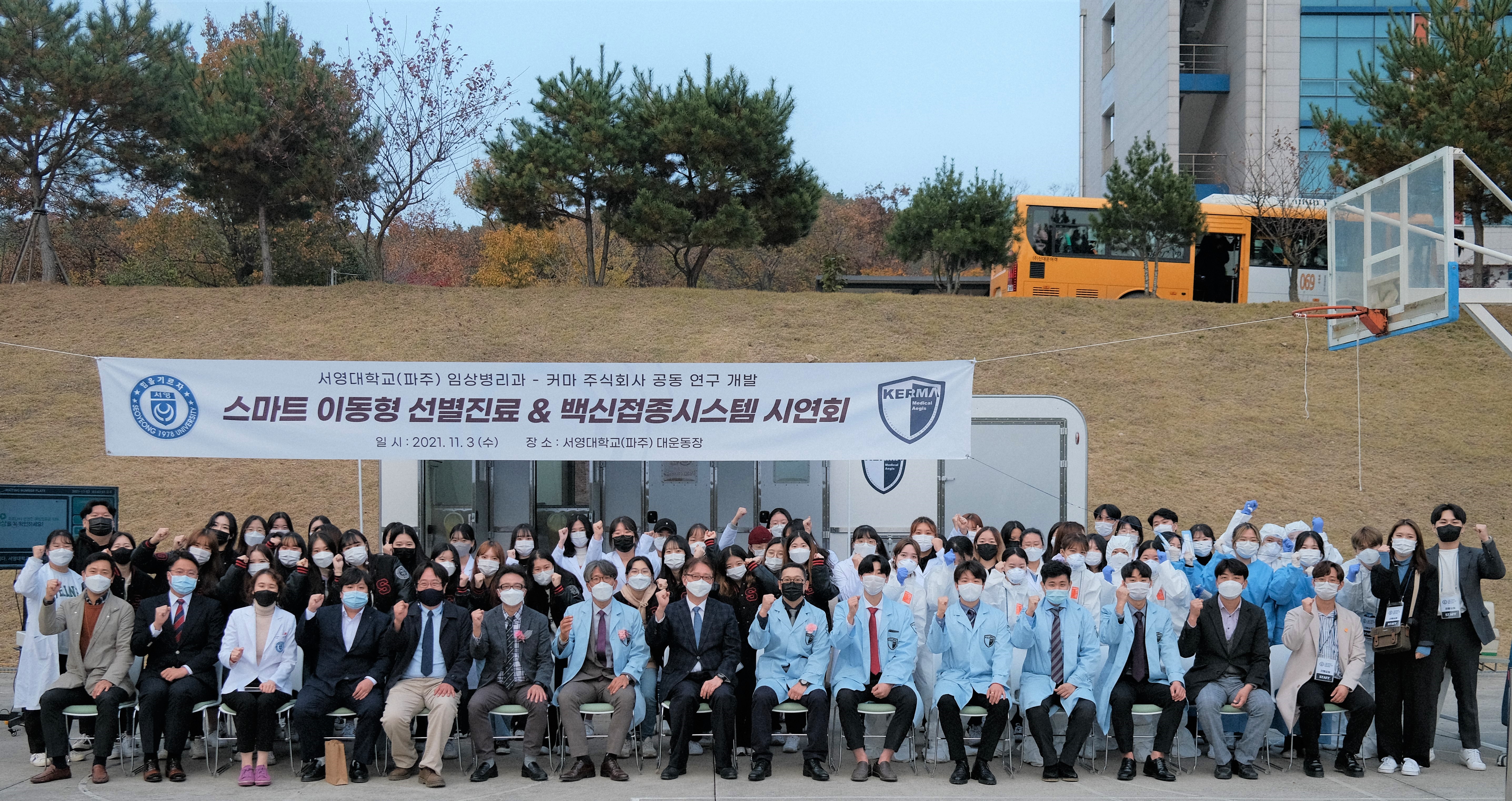 지난 11. 3() 우리대학 소운동장에서 서영대학교(파주) 임상병리학과(학과장 이지웅)와 커마 주식회사(대표 황복희)가 함께 공동 연구 개발스마트 이동형 선별진료 & 백신접종시스템 발표시연회를 개최하였다.