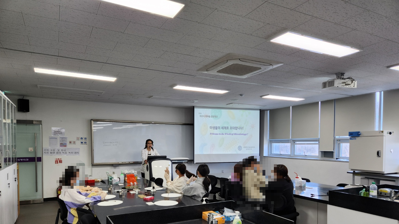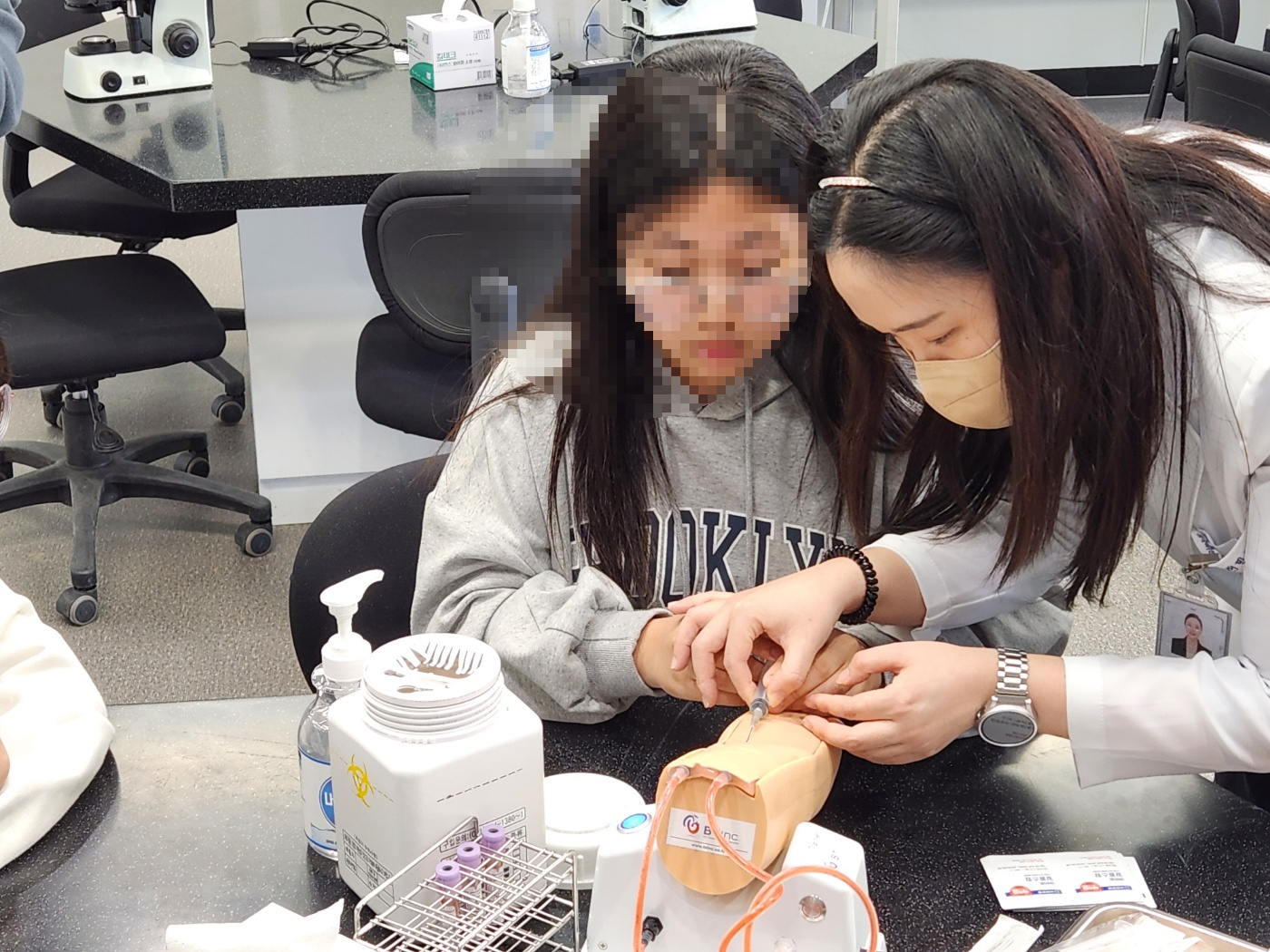 이 날 임상병리학과 체험 프로그램에는 파주시 소재 초·중학교 학생 14명을 대상으로 임상병리학과 이지웅 학과장, 김아름 교수, 이민정 교수, 이경배 교수가 참여하여, '임상병리사' 직업 소개 및 '미생물 배양 체험', '채혈 및 혈액 세포 관찰' 실습까지 이루어졌다.