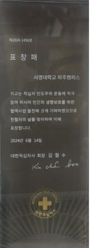 이번에 수상한 표창패는 대한적십자사가 표방하고 있는 인도주의적 운동에 적극 참여한 기관과 개인을 대상으로 수상하는 표창패다. 서영대학교(파주) 임상병리학과는 “인간의 생명보호를 위한 혈액사업 발전에 크게 기여”한 바를 인정 받아 “헌혈의 날”을 맞이하여 해당 표창패를 수상하게 됐다.