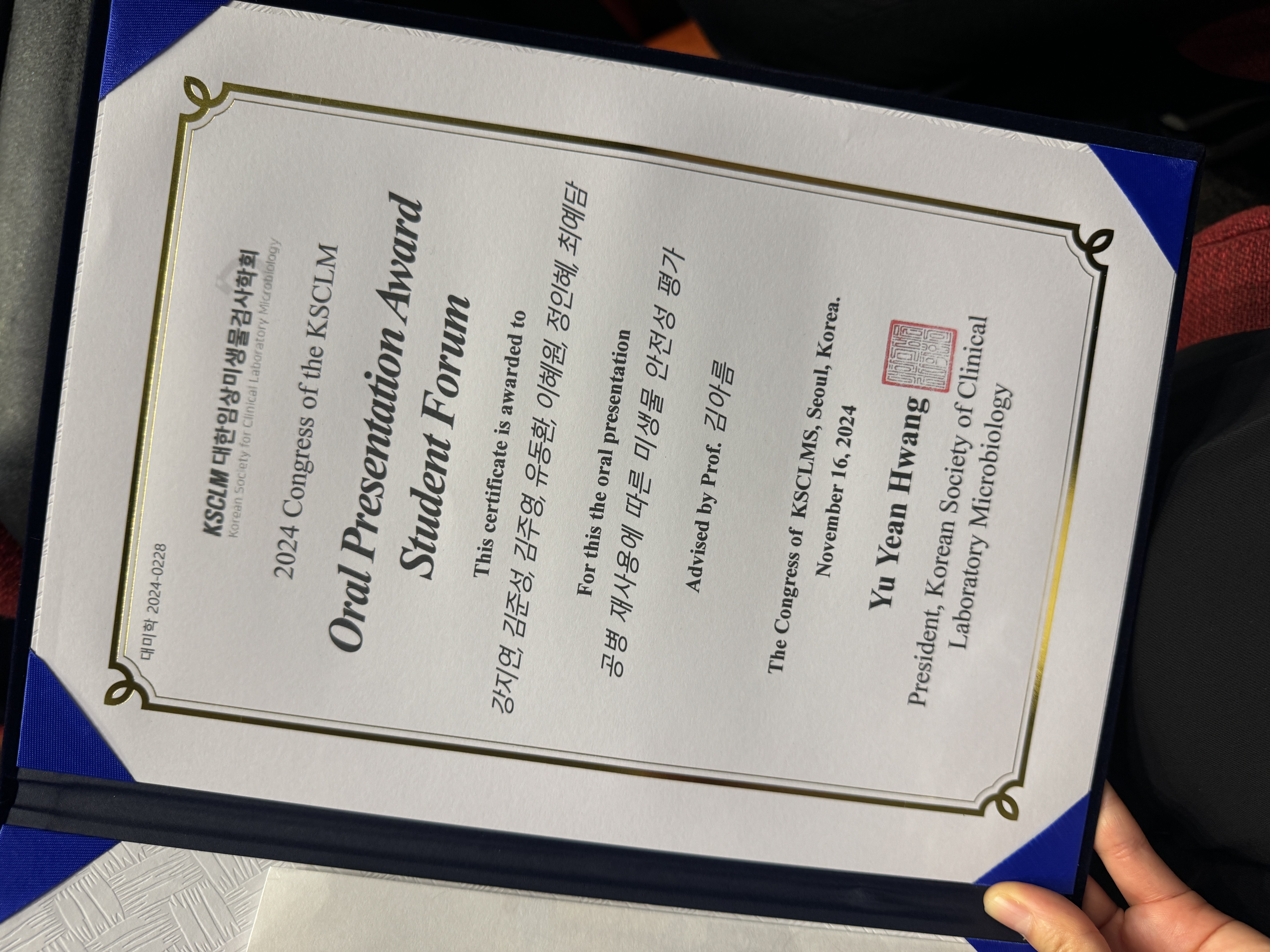 지난 11월 16일, 우리 대학은 신촌세브란스병원에서 열린 '대한임상미생물검사학회 제 2회 학생포럼'에서 최우수상을 수상했다.