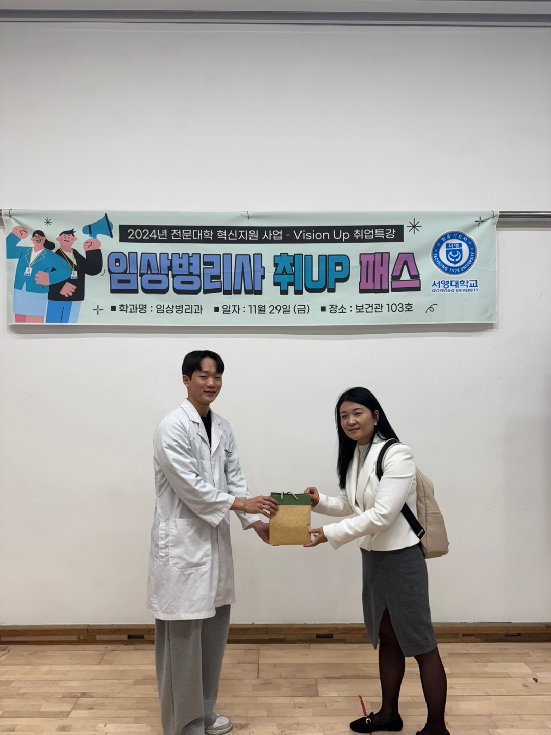 멘토링 시간을 통해 재학생들의 많은 질문에 대한 멘토님의 따뜻한 조언이 이어졌고, 학생들은 다양한 분야에서 활동 중인 임상병리사의 역할과 진로 선택에 대한 구체적인 방향을 제공받을 수 있었습니다. 특히, 비의료기관 스타트업에서 임상병리사가 어떤 가치를 더할 수 있는지 실질적인 정보를 얻는 소중한 시간을 보냈습니다. 마지막에 학생들은 감사의 뜻으로 멘토님께 작은 선물을 전달하였습니다.