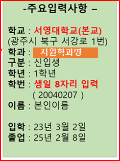 (  입학 전 학번 미부여  신청자 는 학번란에  생년월일 8자리 입력 )