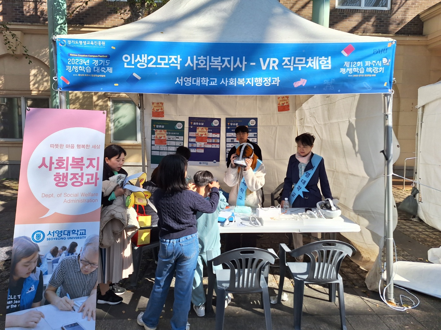저희 교수님들 인솔하에 사회복지행정과 1,2학년 학생들이 VR 활용한 직무제험(인생 2모작)이라는 주제로 체험부스를 운영하였습니다.