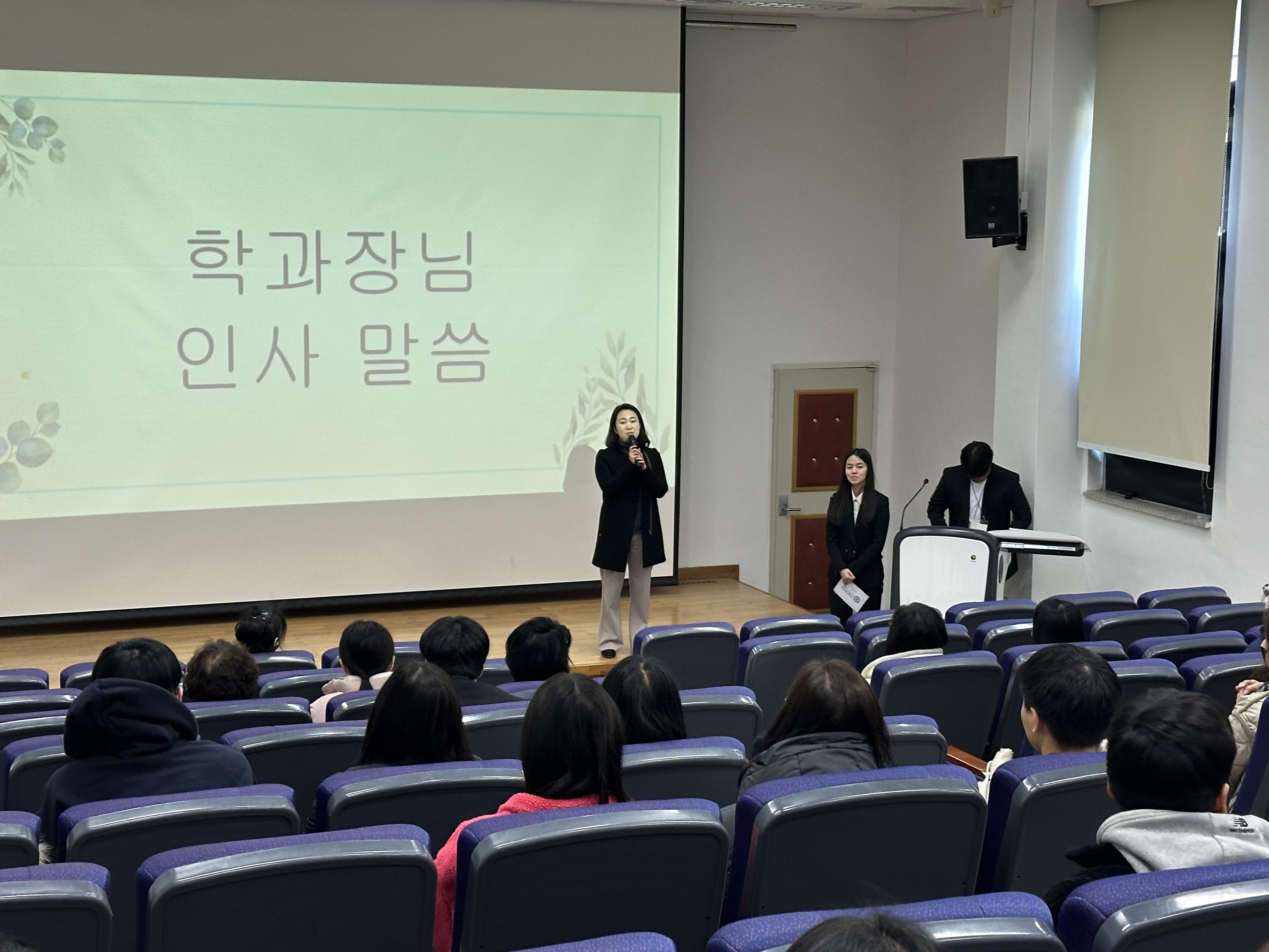 대면식은 김효선 학과장님의 말씀과 교수님들의 소개를 시작으로, 학생회 소개 및 친목을 다지는 레크리에이션 활동까지 다채롭게 진행되었습니다. 특히 교수님들께서 마련해 주신 다양한 상품 덕분에 더욱 즐겁고 의미 있는 시간이 되었습니다.