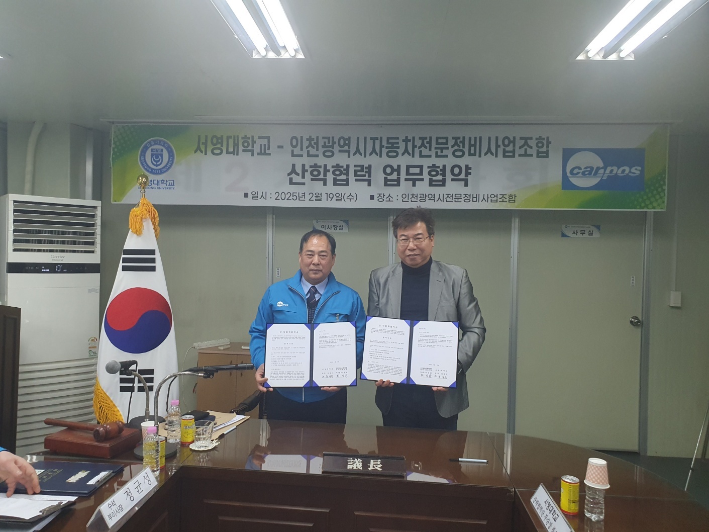 O. 우리대학(총장 김정수)은 2월12일(수) 인천광역시 자동차전문정비사업조합(이사장 최성남)과 자동차 신산업 공동 발전 및 조합원 미래 평생 교육 참여 강화 등을 위한 업무협약을 체결하였다. 인천광역시 조합 회의실에서 진행된 협약식은 서영대학교 산학협력단 부단장 봉필준, 미래자동차과 학과장 송락현, 김진태교수 외 서영대학교 관계자와 인천광역시 자동차전문정비사업조합 최성남 이사장 및 지회장 외 관계자 20명이 참석하였다.