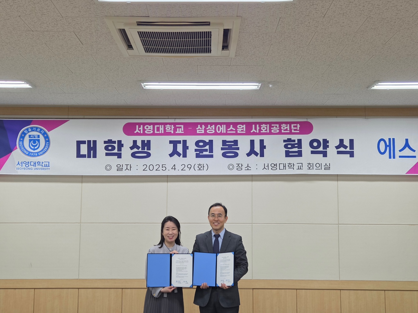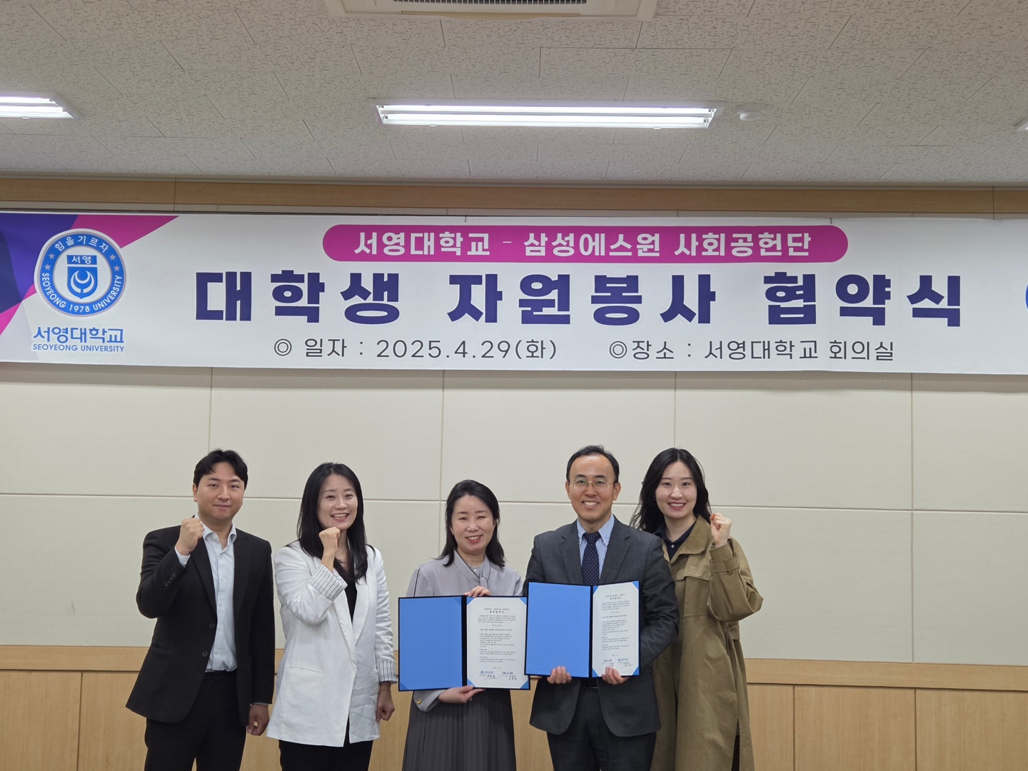 O. 우리대학(총장 김정수) 사회복지행정과(학과장 김효선)는 사회복지전공 학생들의 전공역량 강화를 위하여 삼성에스원 사회공헌단과의 대학생 자원봉사 협약식을 진행하였다. 서영대학교 회의실에서 진행된 협약식은 사회복지행정과 학과장 김효선교수, 권지혜 교수, 김민철 교수 등 대학 관계자와 삼성에스원 사회공헌단 신영빈 팀장 외 기관 관계자가 참석하였다. 서영대학교-삼성에스원 사회공헌단 대학생 자원봉사 업무협약식은 업무협약 체결, 대학생 자원봉사 발대식 등의 순서로 진행되었다.