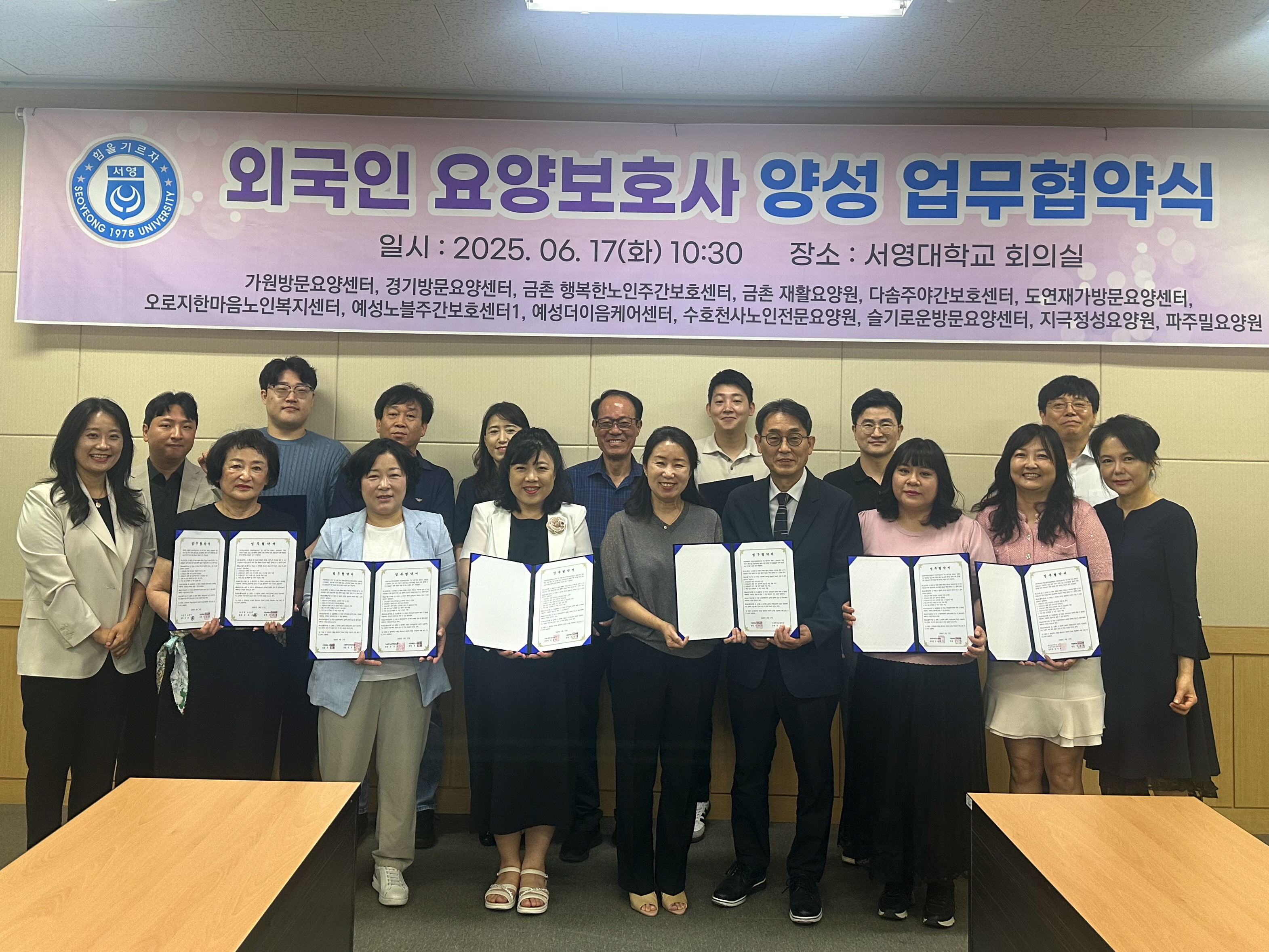 ○ 서영대학교(총장 김정수) 국제교육원(원장 주승완)은 경기지역 노인요양기관과 외국인 요양보호사 양성을 위한 MOU를 체결하였다. 2025년 6월 17일(화) 서영대학교 회의실에서 진행된 협약식에는 서영대학교 국제교육원 박용환 부원장, 사회복지행정과 김효선 학과장 외 사회복지행정과 학과교수 등 학교관계자와 가원방문요양센터 김경림 센터장, 다솜주야간보호센터 우근제 센터장 등 경기지역 노인요양기관 13곳의 기관 관계자들이 참석하였다.