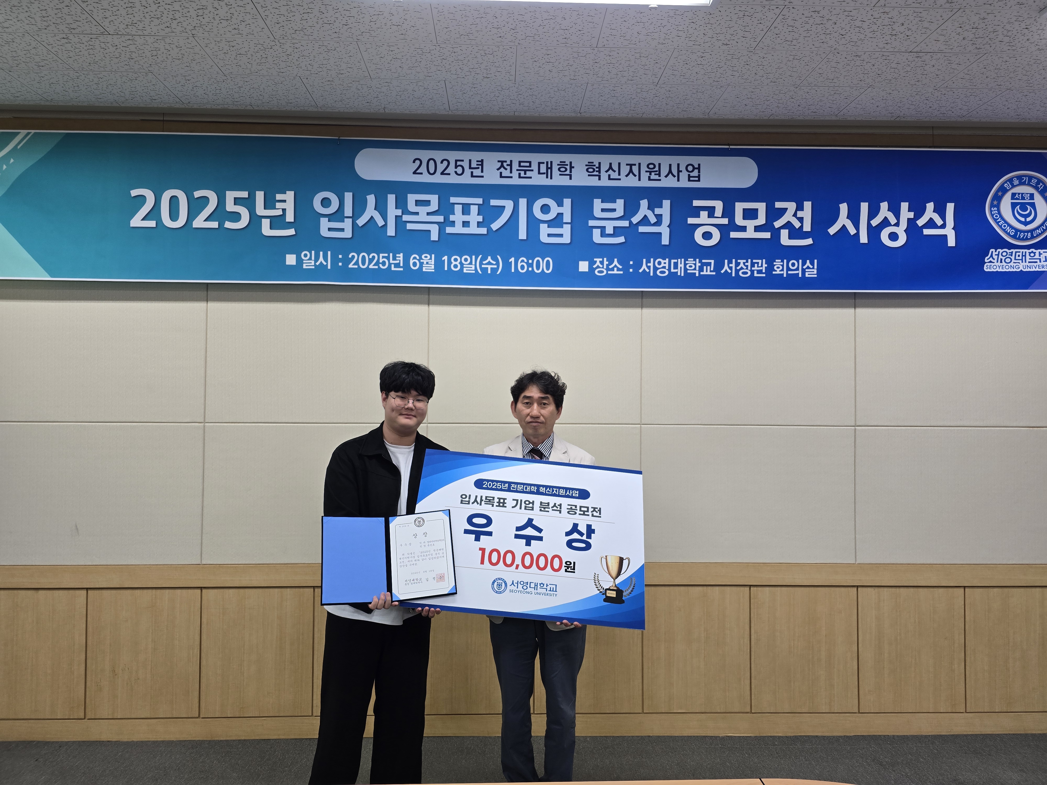 O. 우리대학(총장 김정수) 학생취업처(처장 김명재)는 6월 18일(수) 2025년 전문대학 혁신지원사업의 일환으로 2025년 서영대학교 입사목표기업 분석 공모전 시상식을 진행하였다. 서정관 회의실에서 진행된 행사에는 김명재 취업처장을 비롯하여 학생취업처 교직원 8명과 재학생 수상자 16명 등이 참석하였다.
