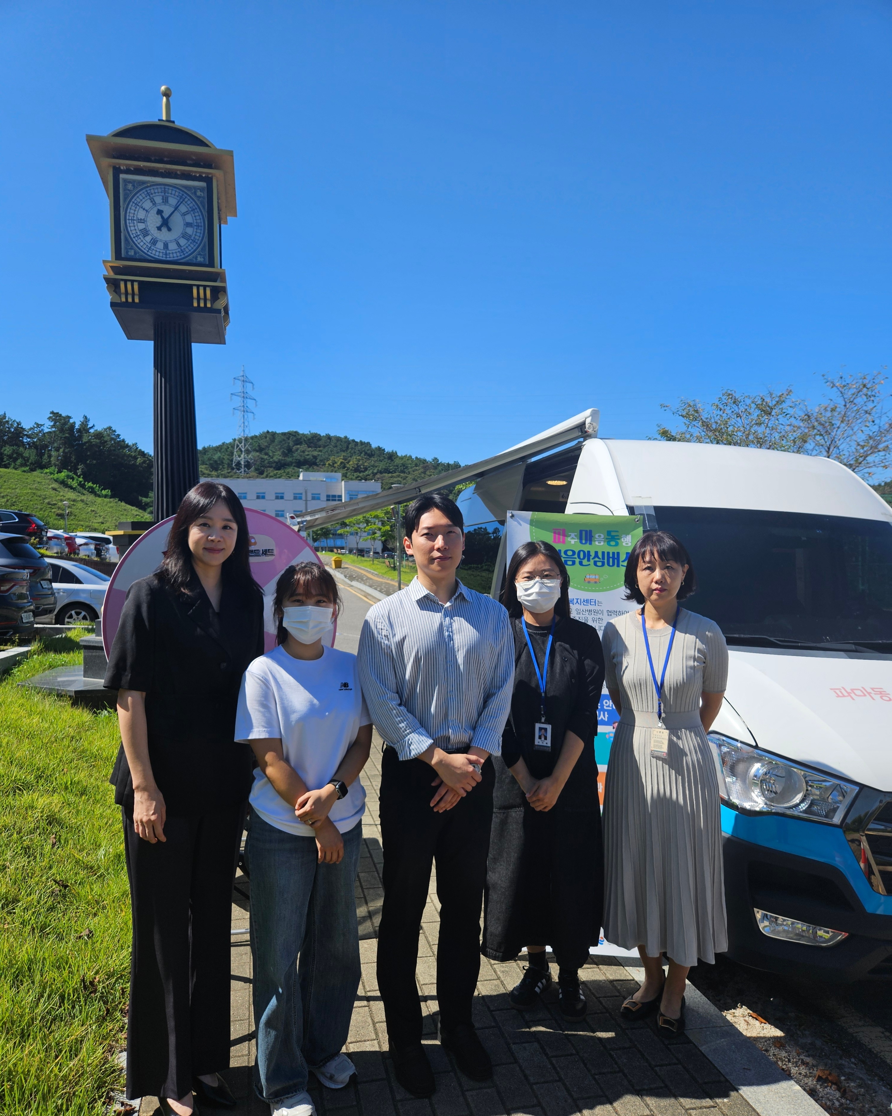 O. 우리대학(총장 김정수) 인권상담센터(부센터장 오민정)는 파주시정신건강복지센터와 업무협의를 통해 '청년 정신건강증진을 위한 2030 파주마음동행 마음안심버스 사업'을 진행하였다. 9월 10일(수)에 진행된 '2030 파주마음동행 마음안심버스' 사업에는 오민정 인권상담센터 부센터장, 강성민 인권상담센터 상담사, 김미정 사회복지사, 이지혜 사회복지사, 배지영 사회복지사 등 총 5명이 참석하였다.