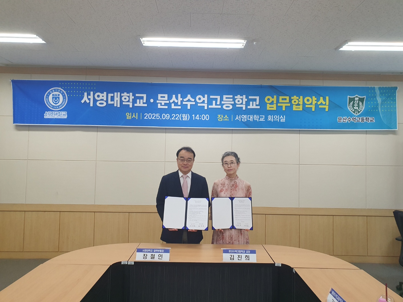 O. 서영대학교 파주캠퍼스(총장 김정수)는 9월 22일(월) 문산수억고등학교와 지역사회 발전과 우수 인재 육성을 위한 업무협약을 체결하였다. 서영대학교 회의실에서 진행된 협약식에는 서영대학교 장철인 입학부총장, 김명재 학생취업처장 외 서영대학교 관계자와 문산수억고등학교 김진희 교장, 김영미 진로부장, 김선인 진로상담부 교사가 참여하였다.