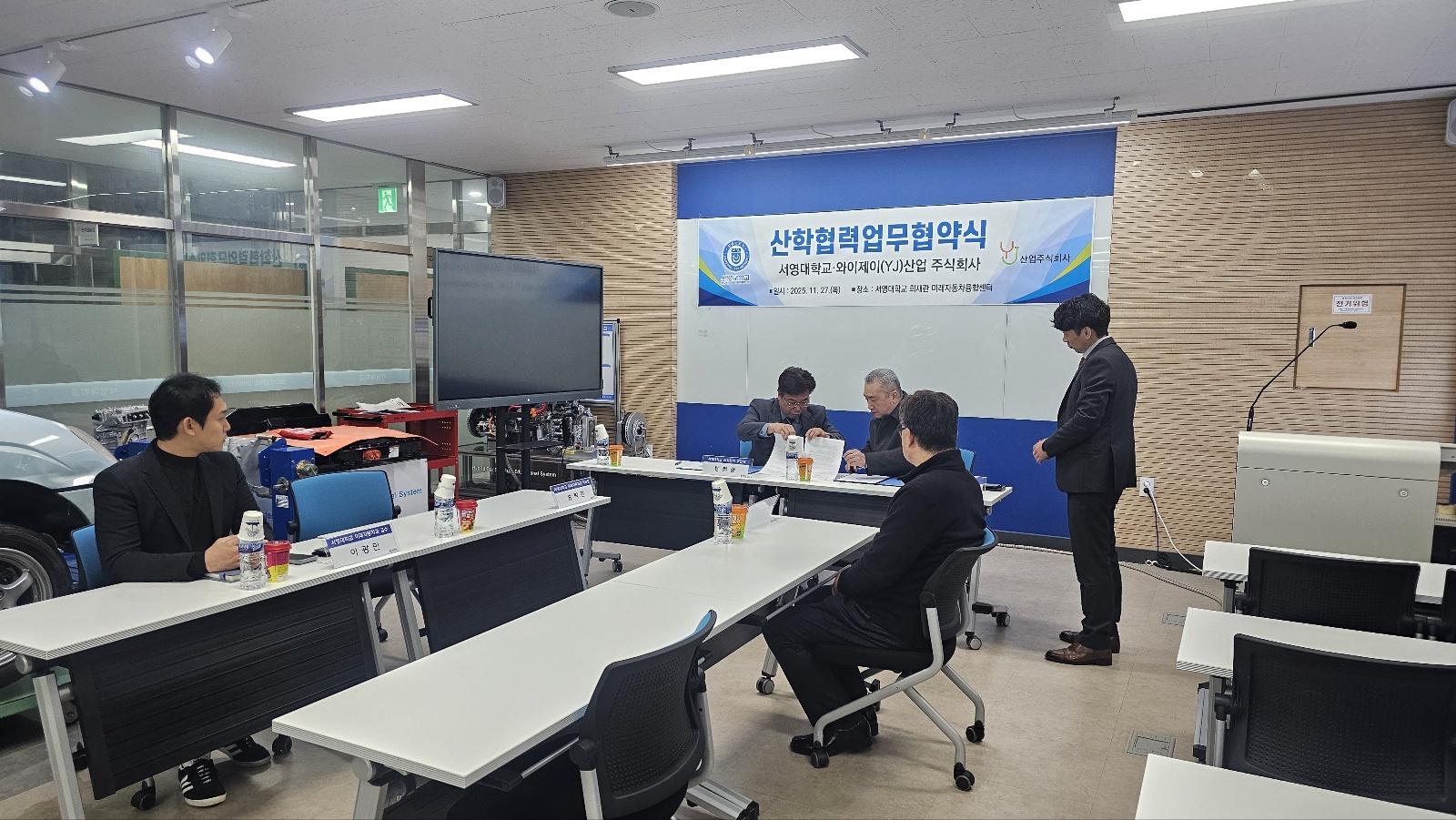 O  미래자동차 기술융합센터에서 진행된 업무협약식에는 서영대학교 산학협력단 봉필준 경기도 RISE 사업단장, 미래자동차과 송락현 학과장, 미래자동차과 이광민 교수 등 학교 관계자와 와이제이산업()의 박태동 대표이사, 김영진 연구소장 등 산업체 관계자가 참석하였다.