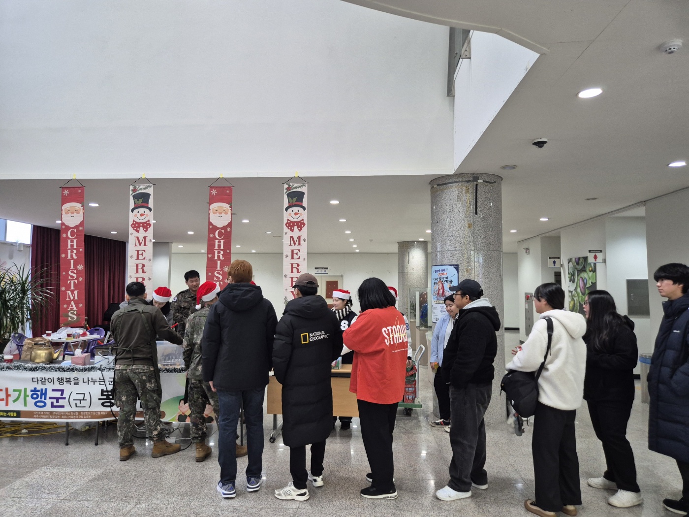 ○ 우리대학(총장 김정수)은 재학생들의 학업 응원을 위해 12월16일(화) 제2기갑여단 군 봉사동아리 '다가행군'과 함께 붕어빵 나눔행사를 진행하였다. 서영관 로비에서 진행된 붕어빵 나눔이벤트는 기말고사를 앞두고 학업에 매진하고 있는 재학생들에게 따뜻한 응원의 마음을 전하고자 마련된 행사이다. 제2기갑여단 군 봉사 동아리 '다가행군' 소속 간부들은 직접 붕어빵을 구워 학생 및 교직원에게 나누며 추운 날씨 속 온기를 전했다.